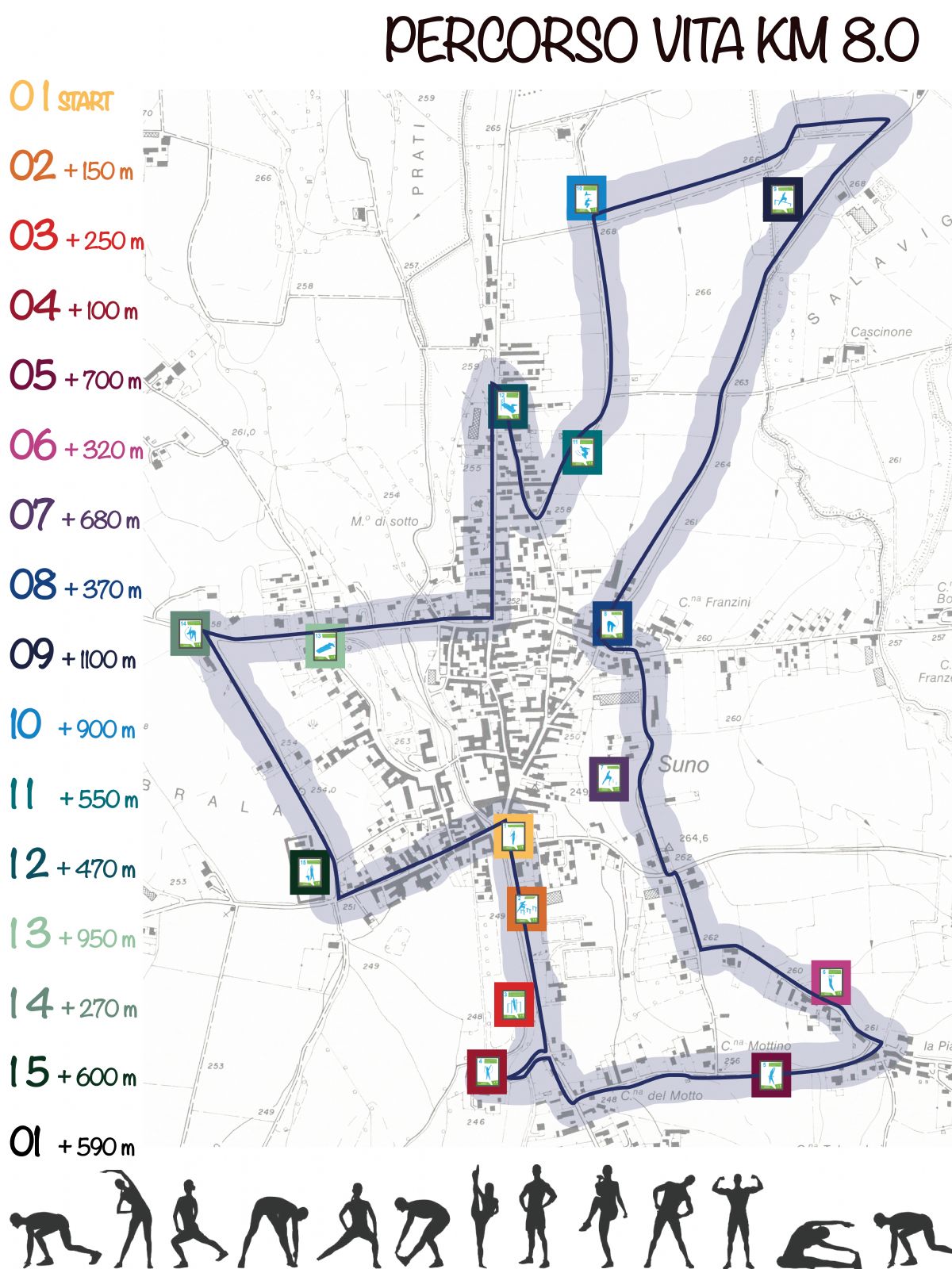 Il Percorso Vita è un tipo di allenamento sportivo adatto a tutti, diffuso in tutta Europa, che consiste in un circuito su cui si prevede un programma di attività motorie a tappe: in ogni postazione è possibile eseguire un esercizio con l’ausilio di attrezzature collocate lungo il percorso. Ideato dal consigliere Lorenzo Corti il percorso vita di Suno è di 8 km con 15 pannelli e attrezzature per la ginnastica, si sviluppa ad anello partendo da piazza Martiri e tocca la chiesa di San Genesio, la Piana, via Volta, via Conturbia per proseguire tra i campi fino a via Arona, via Bogogno e ritornare in piazza. Tra gli scorci più suggestivi del paese e con lo scenario del Monte Rosa, è sicuramente da provare, in tutta tranquillità o a passo di corsa, adatto a tutte le età. Orari di frequenza, intensità e quantità di esercizi si possono scegliere in libertà: è un percorso anti stress che combina attività aerobica con la tonificazione, si bruciano grassi, si rinforza la muscolatura e si migliora il coordinamento.