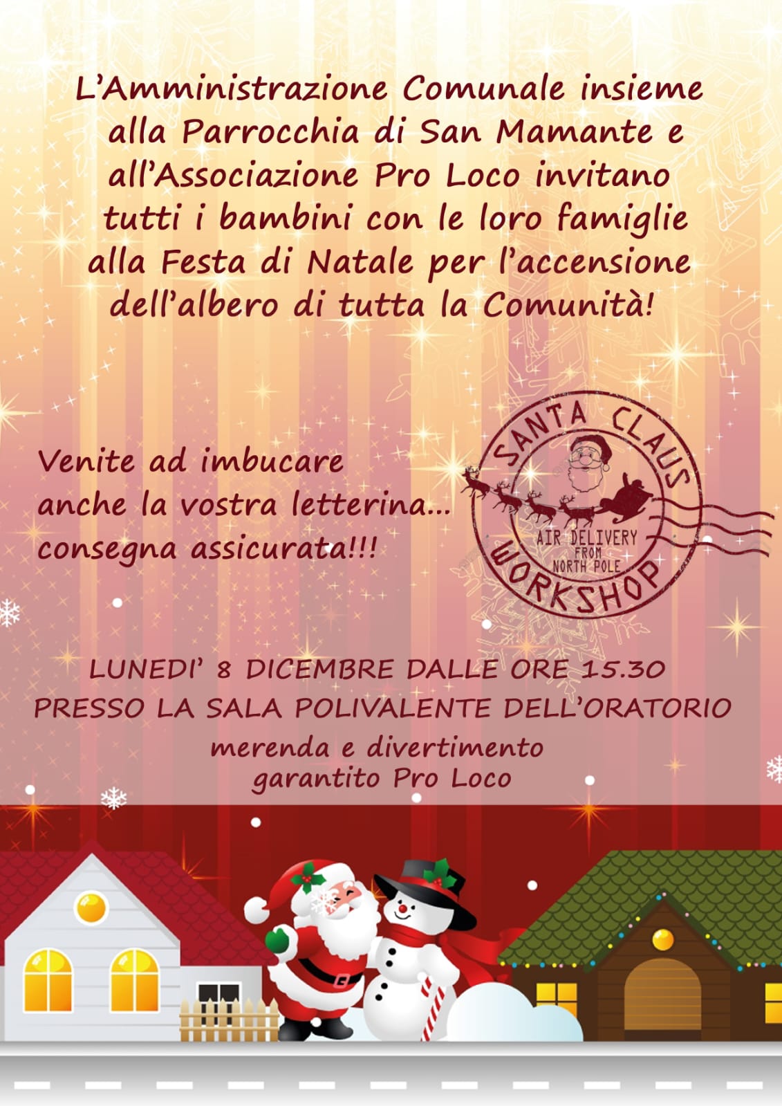 L'Amministrazione Comunale insieme alla Parrocchia di San Mamante e all'associazione Pro Loco invitano tutti i bambini con le loro famiglie alla Festa di Natale con l'accensione dell'albero di tutta la comunità.