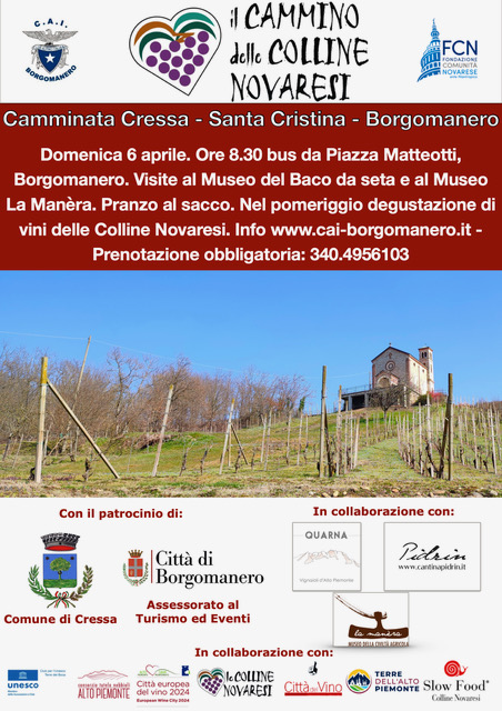 La sezione di Borgomanero del Club Alpino Italiano, insieme a Fondazione Comunità Novarese e a tantissimi altri soggetti, sta lavorando alla realizzazione del "Cammino delle Colline Novaresi", nell'ambito del quale, organizza una Camminata Domenica 6 Aprile 2025 con percorso : CRESSA - SANTA CRISTINA - BORGOMANERO