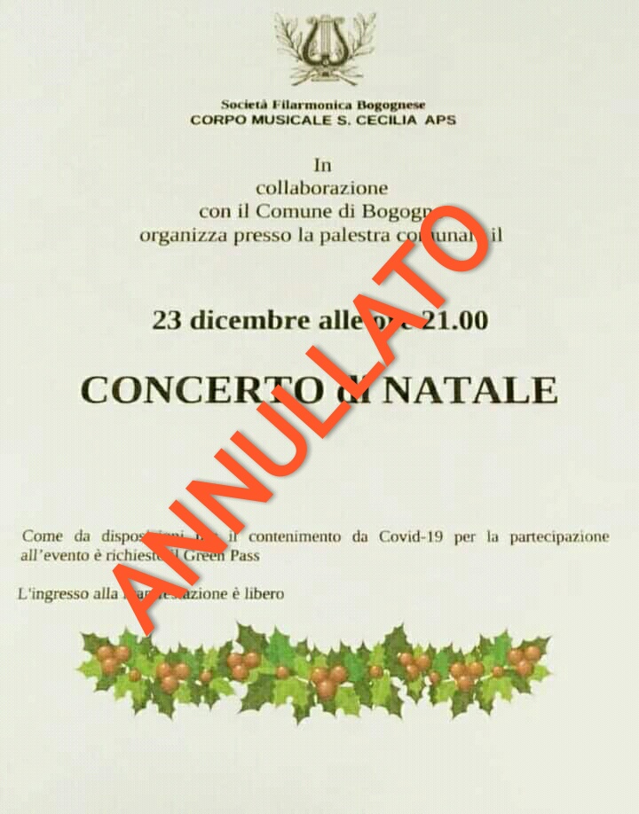 Si comunica che a causa dell’aumento dei contagi da Covid-19, anche all’interno del nostro Comune, il Concerto di Natale previsto per il 23.12 è stato precauzionalmente annullato.