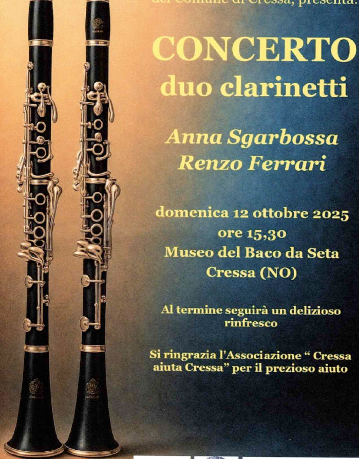 L'associazione culturale Schola Cantorum S.S. Giulio e Amatore APS di Cressa presenta il Concerto Duo di Clarinetti con i Musicisti Anna Sgarbossa e Renzo Ferrari - Domenica 12 Ottobre 2025 alle ore 15.30 presso il Museo del Baco da Seta.