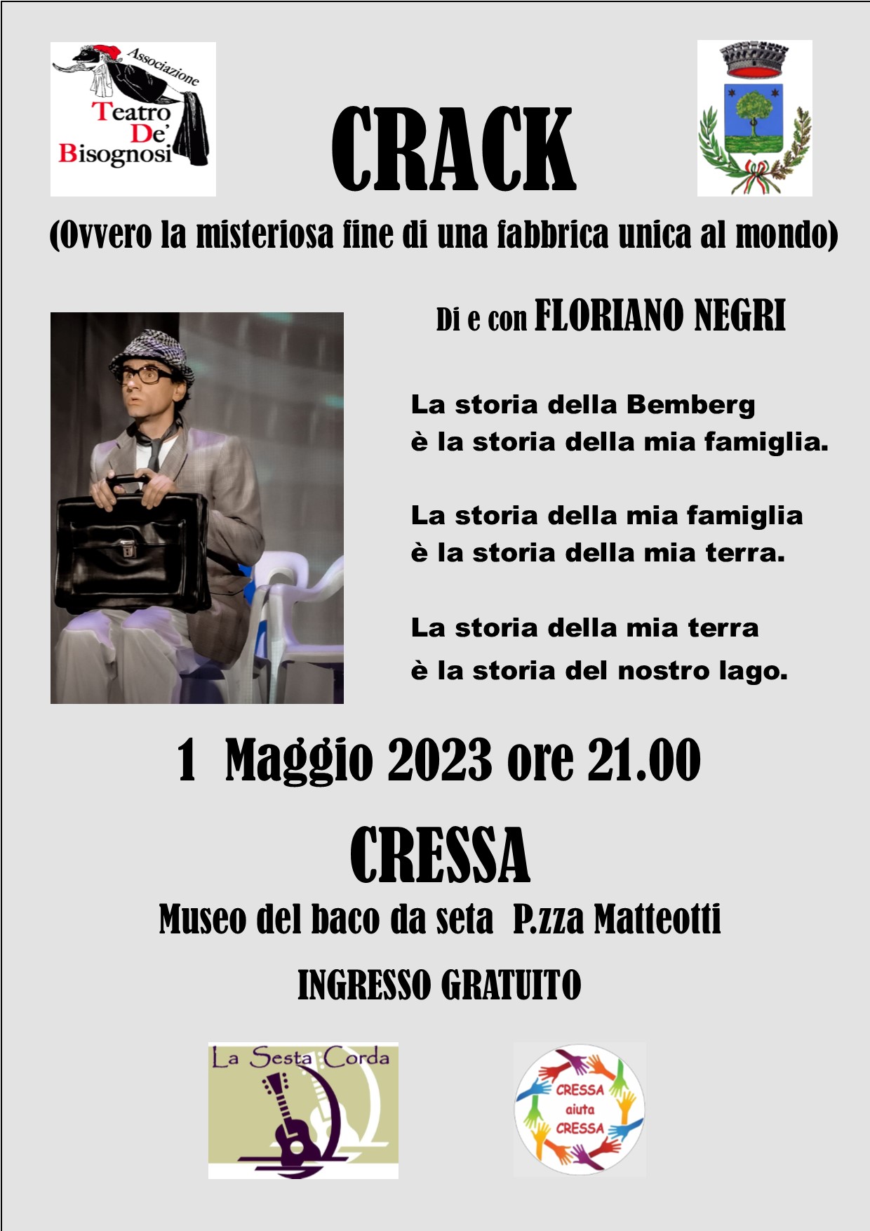 L'Associazione Musicale La Sesta Corda, in collaborazione con Cressa aiuta Cressa, propone, per la serata di Lunedì 1° Maggio, un monologo teatrale dal titolo "CRACK" a cura di Floriano Negri, con Ingresso Libero