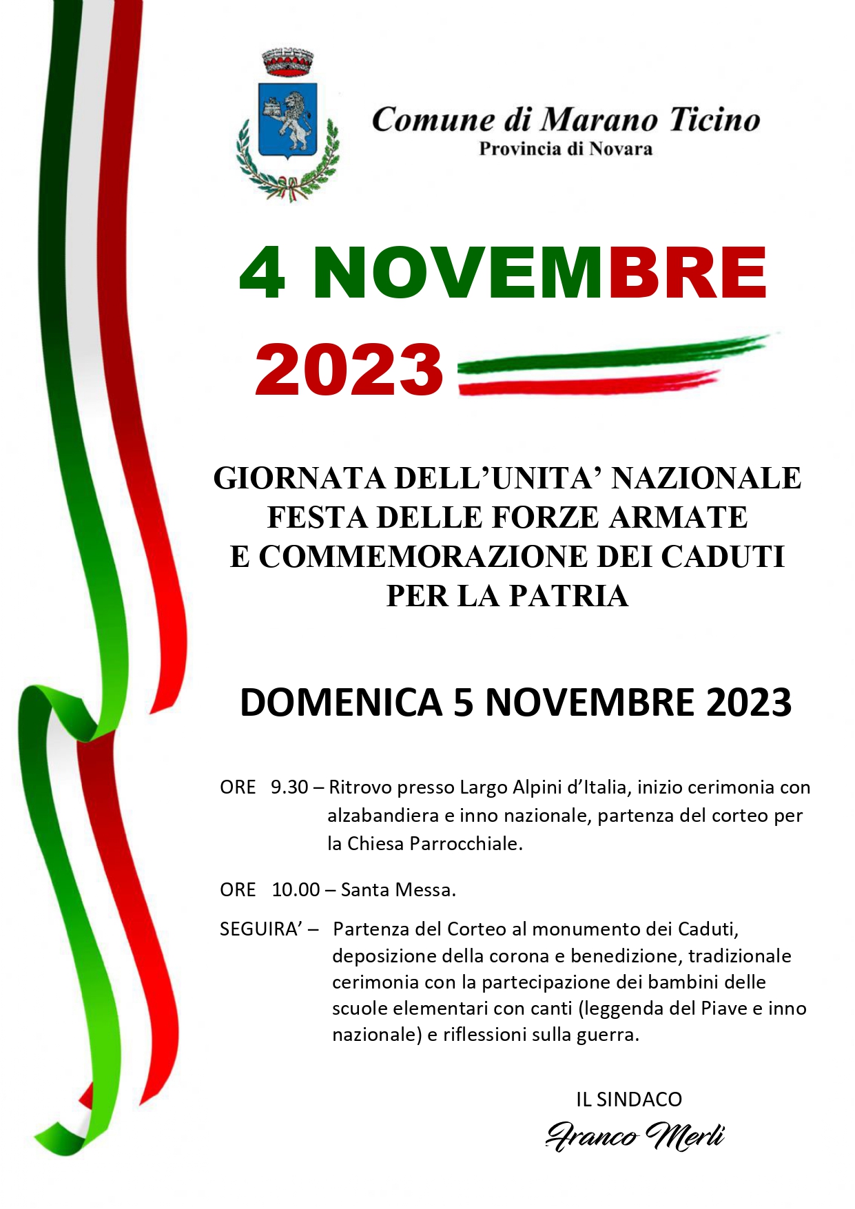 ore 9.30 – ritrovo presso largo alpini d’italia, inizio cerimonia con alzabandiera e inno nazionale, partenza del corteo per la chiesa parrocchiale.