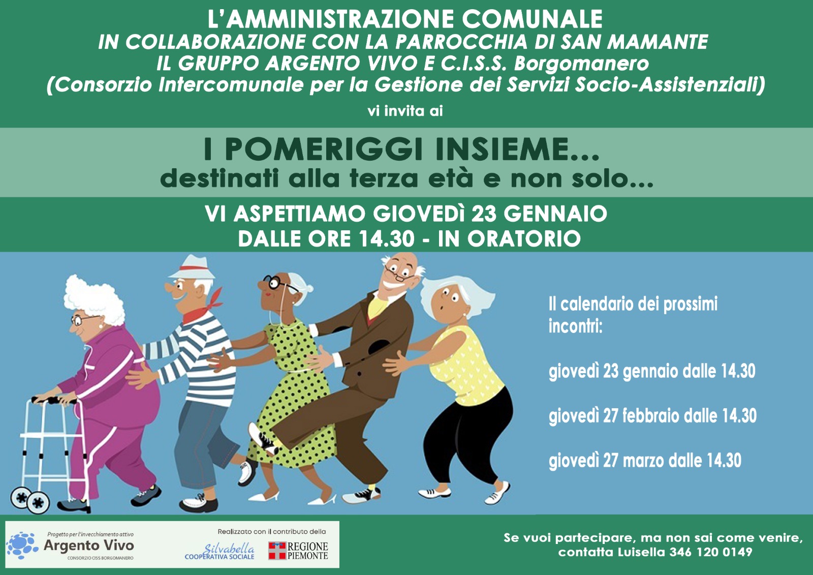 L'Amministrazione Comunale in collaborazione con la Parrocchia di San Mamante e il Gruppo Argento Vivo e il C.I.S.S. di Borgomanero (No) vi invita ai "I pomeriggi insieme... destinato alla terza età e non solo..."