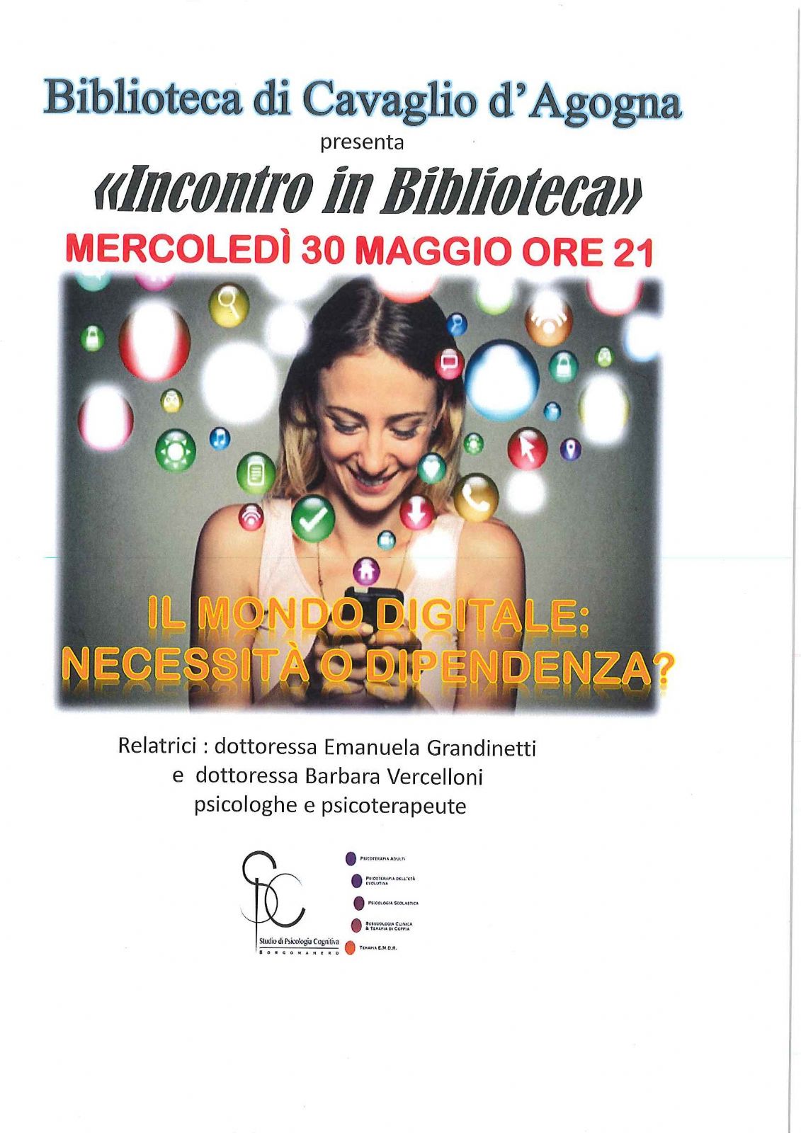 La Biblioteca di Cavaglio d'Agogna presenta "Incontro in Biblioteca" - Mercoledì 30 Maggio 2018 dal titolo: "Il mondo digitale: necessità' o dipendenza?"
