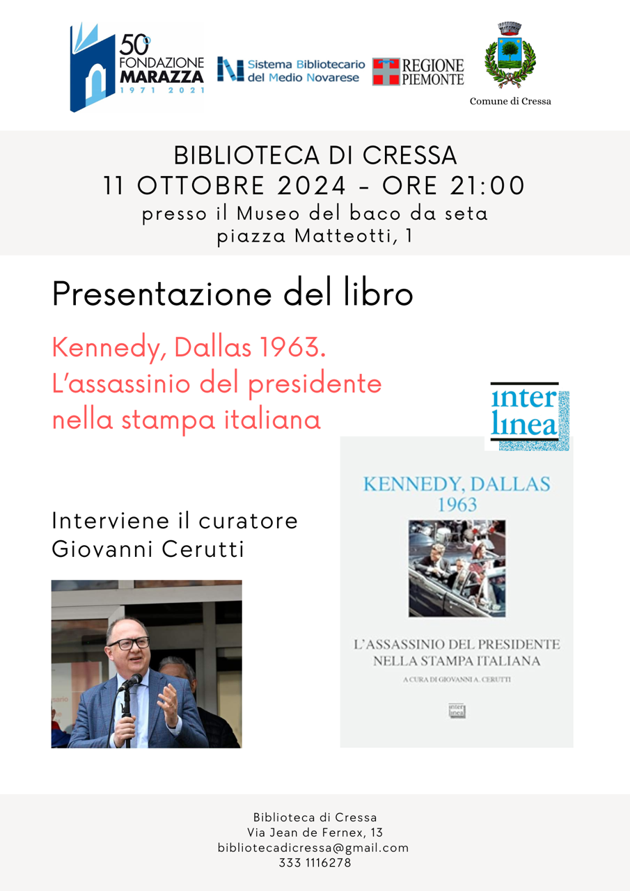 La Biblioteca Comunale "Aldo Marchini" di Cressa è lieta di annunciare per la serata di Venerdì 11 Ottobre 2024, presso la Sala del Museo del Baco da Seta, alle ore 21.00, la presentazione del Libro : "Kennedy, Dallas 1963. L'Assassinio del Presidente nella stampa italiana" con l'intervento del curatore Giovanni Cerutti.