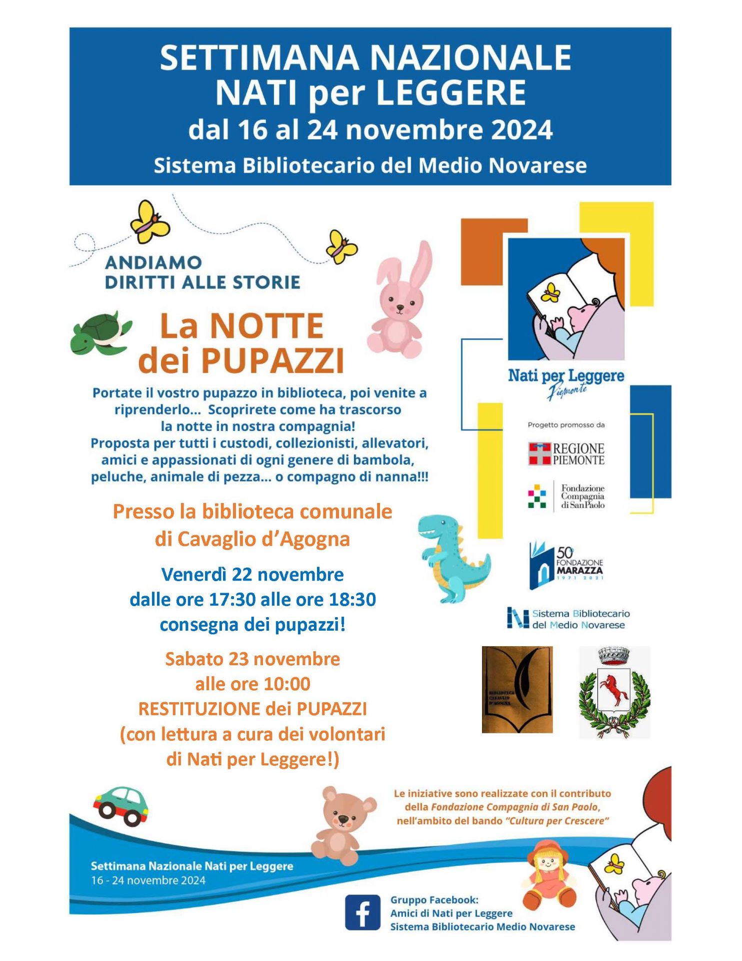 Presso la Biblioteca di Cavaglio d'Agogna - Venerdì 22 novembre dalle ore 17.30 alle ore 18.30 consegna dei pupazzi! - Sabato 23 novembre dalle ore 10.00 RESTITUZIONE dei PUPAZZI (con lettura a cura dei volontari di Nati per Leggere)