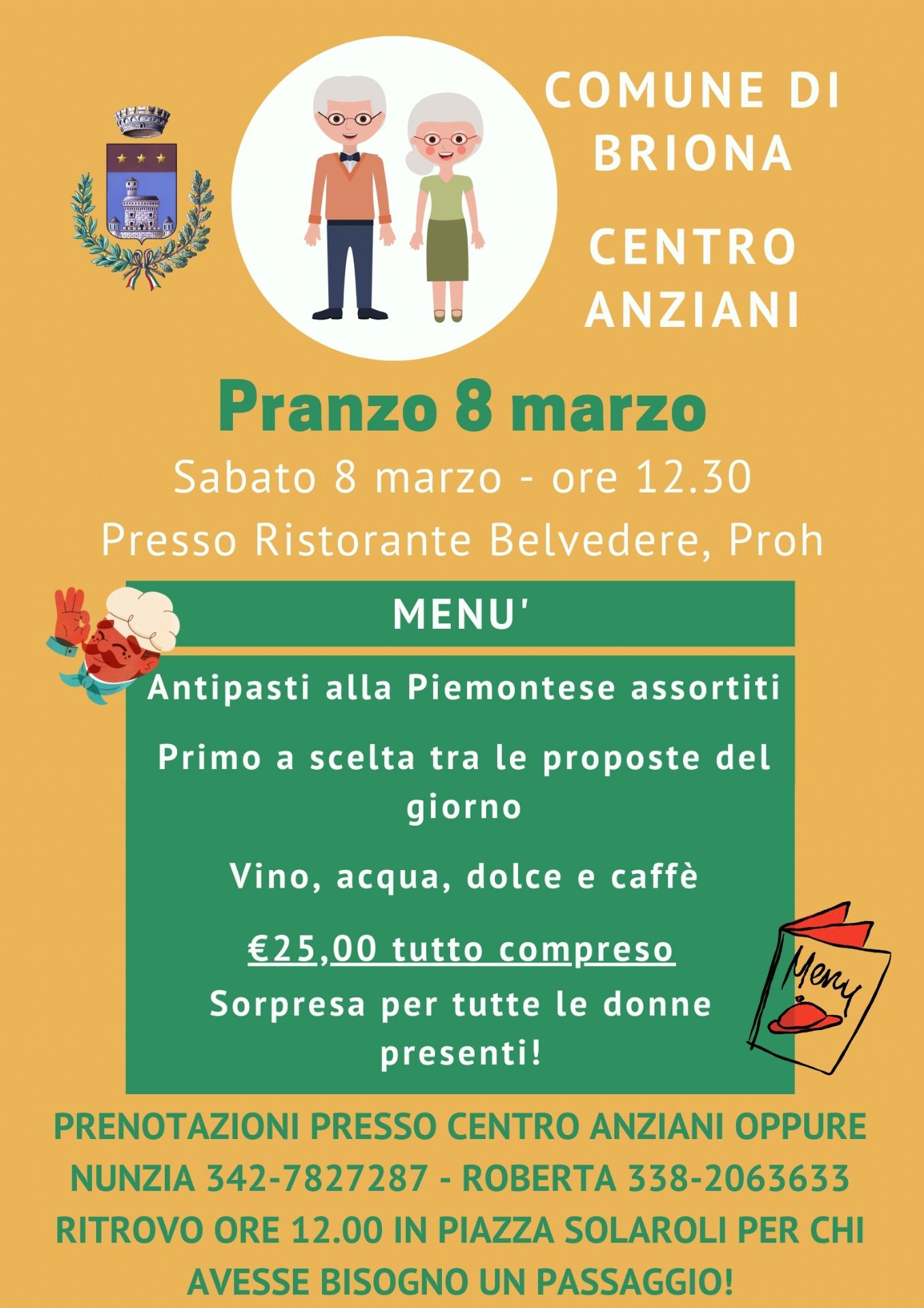 Il Centro Anziani del Comune di Briona organizza per sabato 8 marzo un pranzo aperto a tutti, presso la Trattoria Belvedere Proh.