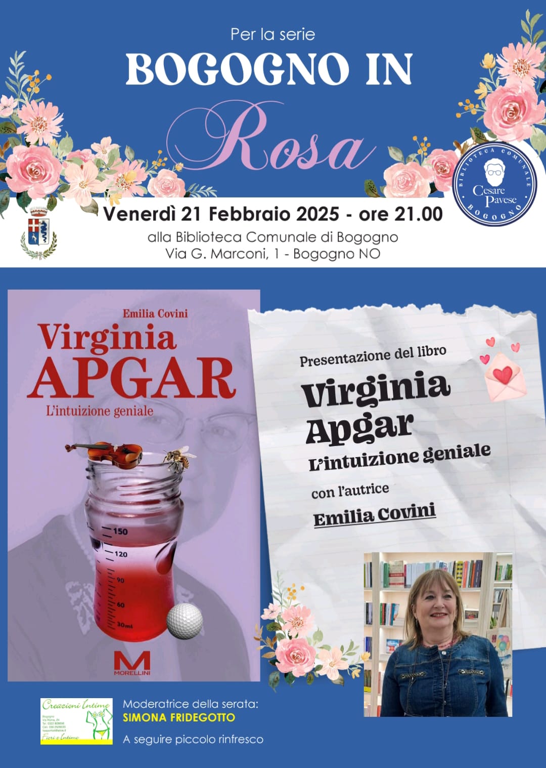 Venerdì 21 febbraio, ore 21, presso la Biblioteca comunale ci verrà a trovare Emilia Covini che a dialogo con Simona Fridegotto presenterà "Virginia Apgar. L'intuizione geniale", un libro dedicato alla dott.ssa Apgar, inventrice del codice Apgar.