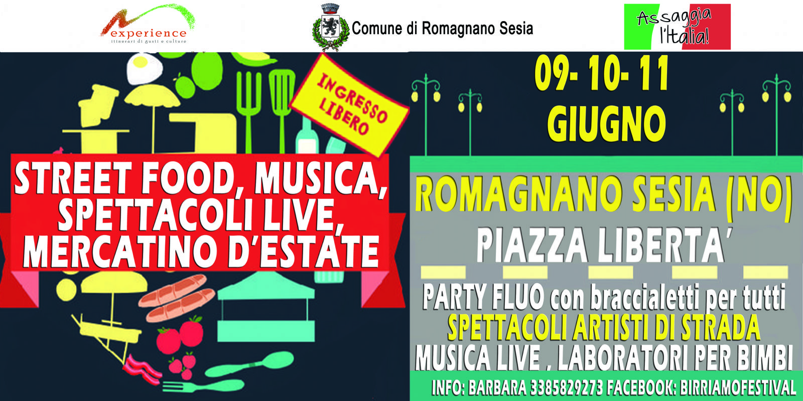 Tre giorni all'insegna del buon cibo e del divertimento per tutte le età, ritorna a Romagnano Sesia lo street food “Assaggia l'Italia” targato Experience. Il 9, 10 e 11 giugno in piazza Libertà una ventina di truck food di qualità proporranno piatti tipici della nostra Penisola e birre artigianali.