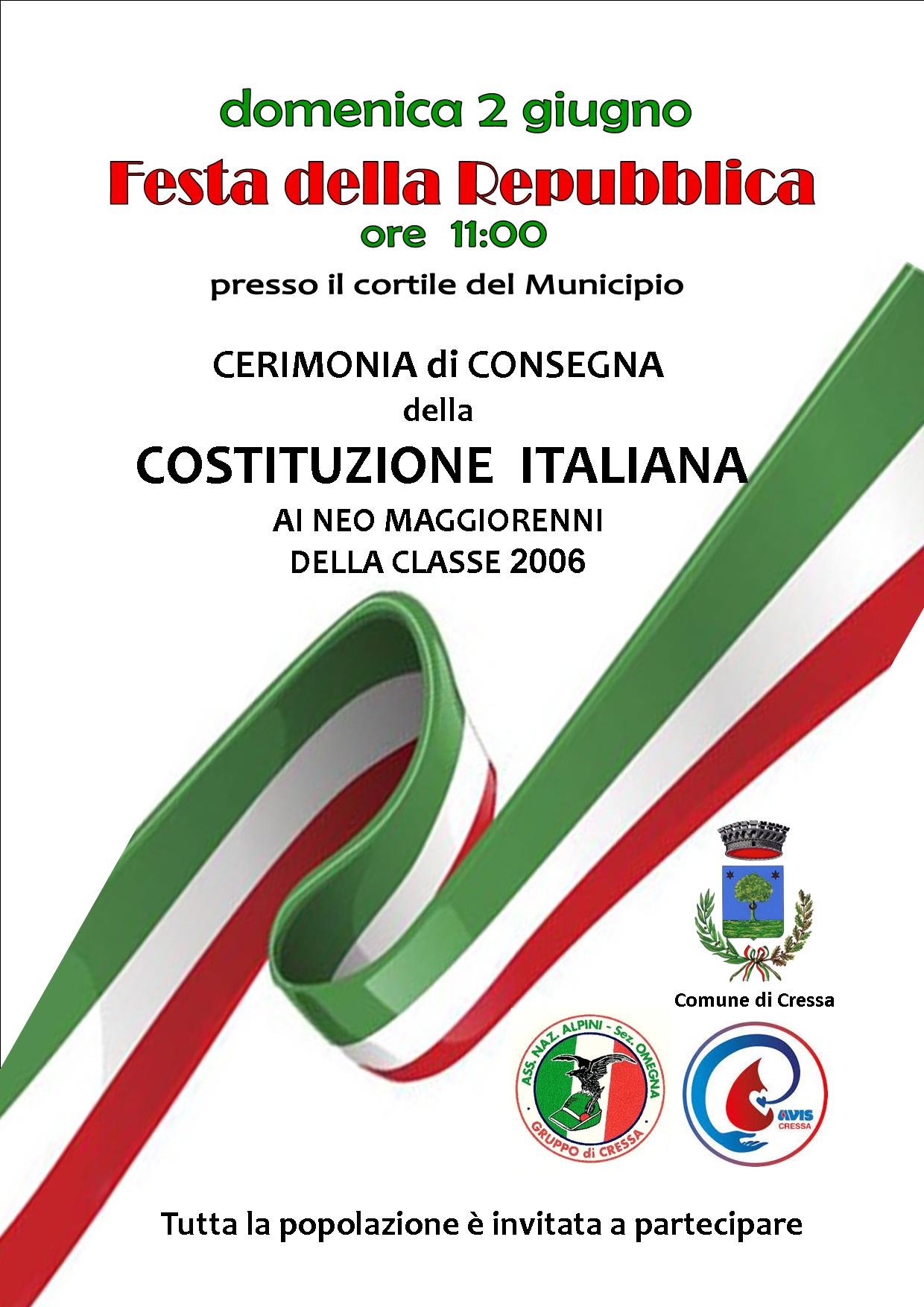 Cerimonia di consegna della Costituzione Italiana ai neo Maggiorenni - Classe 2006 - presso il cortile del Municipio Domenica 2 Giugno 2024 alle ore 11:00