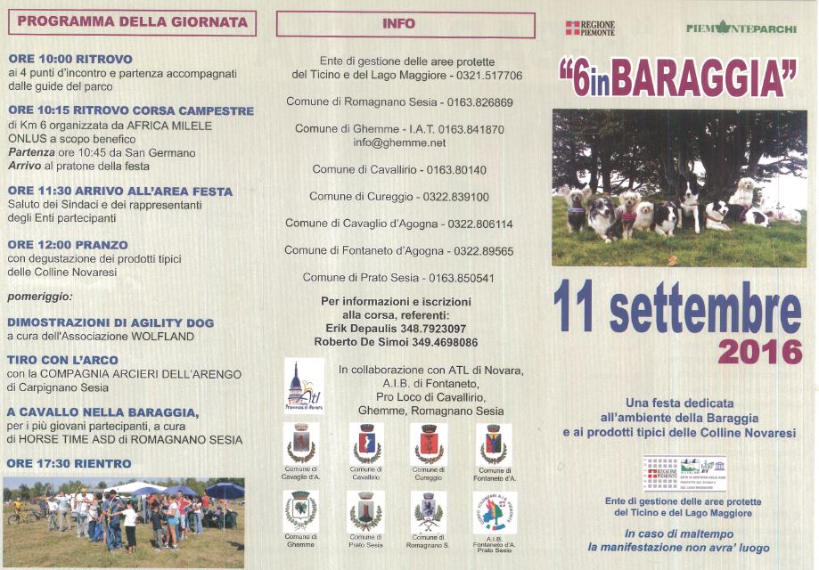 Una dodicesima edizione ricca di eventi, quella in programma per "6 in Baraggia" 2016, organizzata dai Comuni di Romagnano Sesia, Cavaglio d’Agogna, Cavallirio, Cureggio, Fontaneto d’Agogna, Ghemme e Prato Sesia con la collaborazione del nuovo Ente Parco, dell’ATL di Novara, dell'A.I.B. di Fontaneto e delle Pro Loco di Cavalirio, Ghemme, Romagnano Sesia. Come ogni anno, alle ore 10 di domenica 11 settembre, le guide del parco accoglieranno i partecipanti in uno dei quattro punti di ritrovo (Cascina Storni, Cascina Strona, Poianino, S. Germano) e li accompagneranno sul grande pratone accanto alla Cascina della Torba dove saranno presenti i rappresentanti dei Comuni. Al mattino, per la prima volta, si terrà una corsa campestre di 6 km organizzata da Africa Milele Onlus a scopo benefico con ritrovo alle 10:15 a San Germano e partenza alle 10:45.