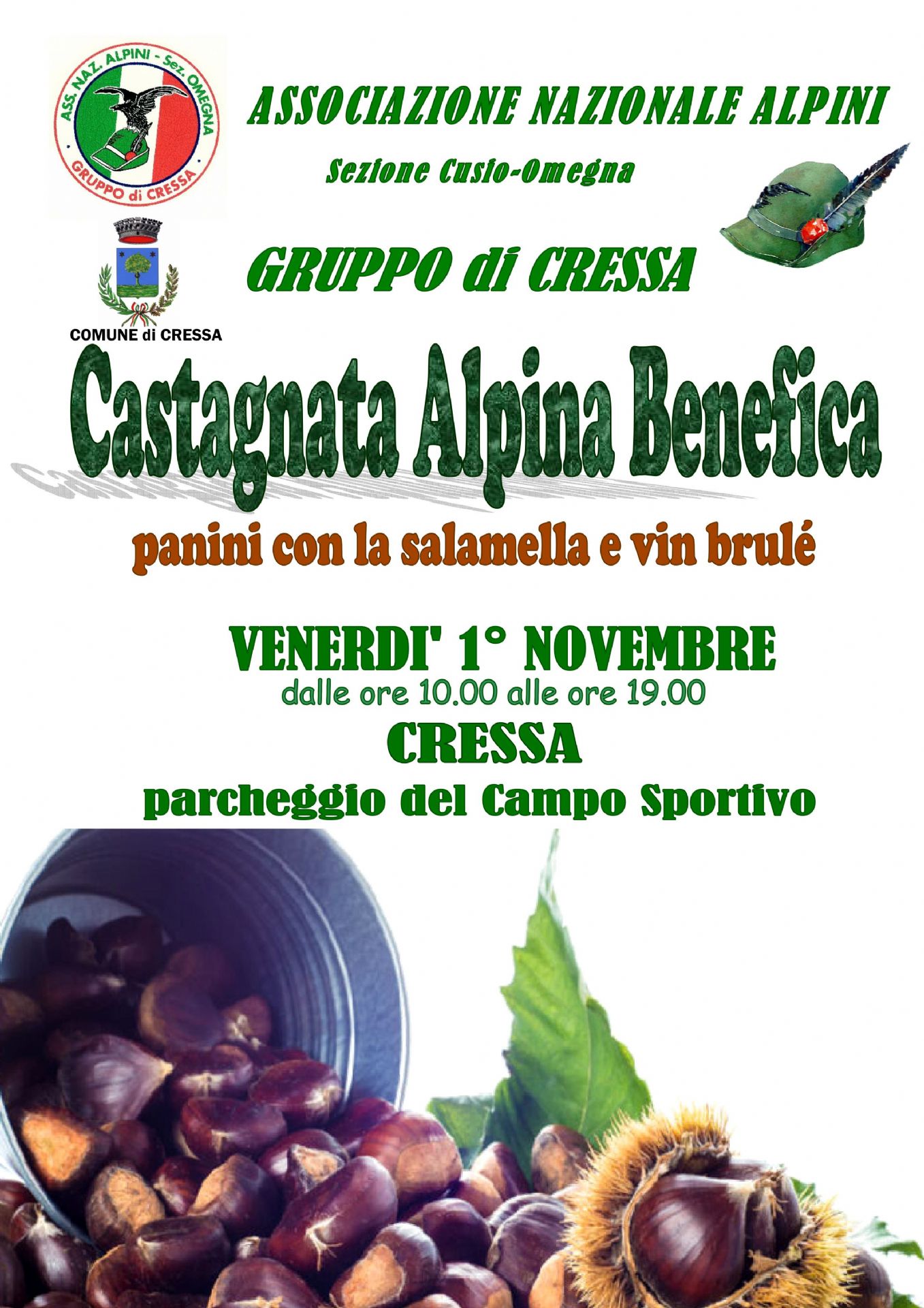 Il Gruppo Alpini di Cressa organizza la Tradizionale "Castagnata Alpina" presso l'area parcheggio antistante il Campo Sportivo di Via Martiri - Dalle ore 9:00 alle ore 19:00 di Sabato 1^ Novembre.