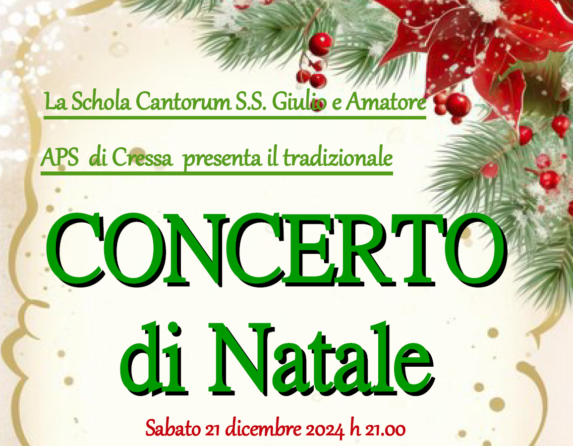 L’Associazione “Schola Cantorum S.S. Giulio e Amatore” APS di Cressa, propone, nell'ambito dei Festeggiamenti Natalizi, il tradizionale “Concerto di Natale”, Edizione 2025, Sabato 20 Dicembre 2025 alle ore 21.00 presso la Chiesa Parrocchiale Santi Giulio e Amatore di Cressa, con la partecipazione del Gruppo vocale Harmonycum di Invorio.