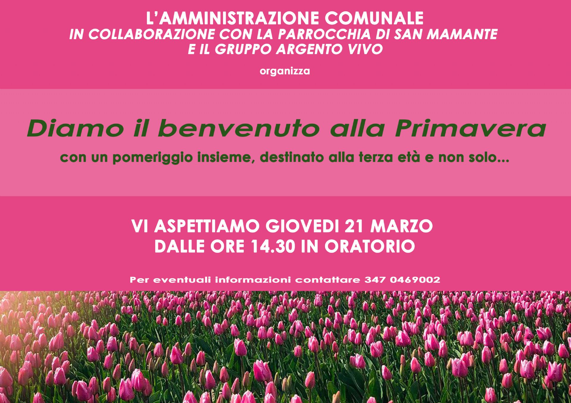 L'Amministrazione Comunale in collaborazione con la Parrocchia di San Mamante e il Gruppo Argento Vivo organizza "Diamo il benvenuto alla Primavera" con un pomeriggio insieme, destinato alla terza età e non solo...