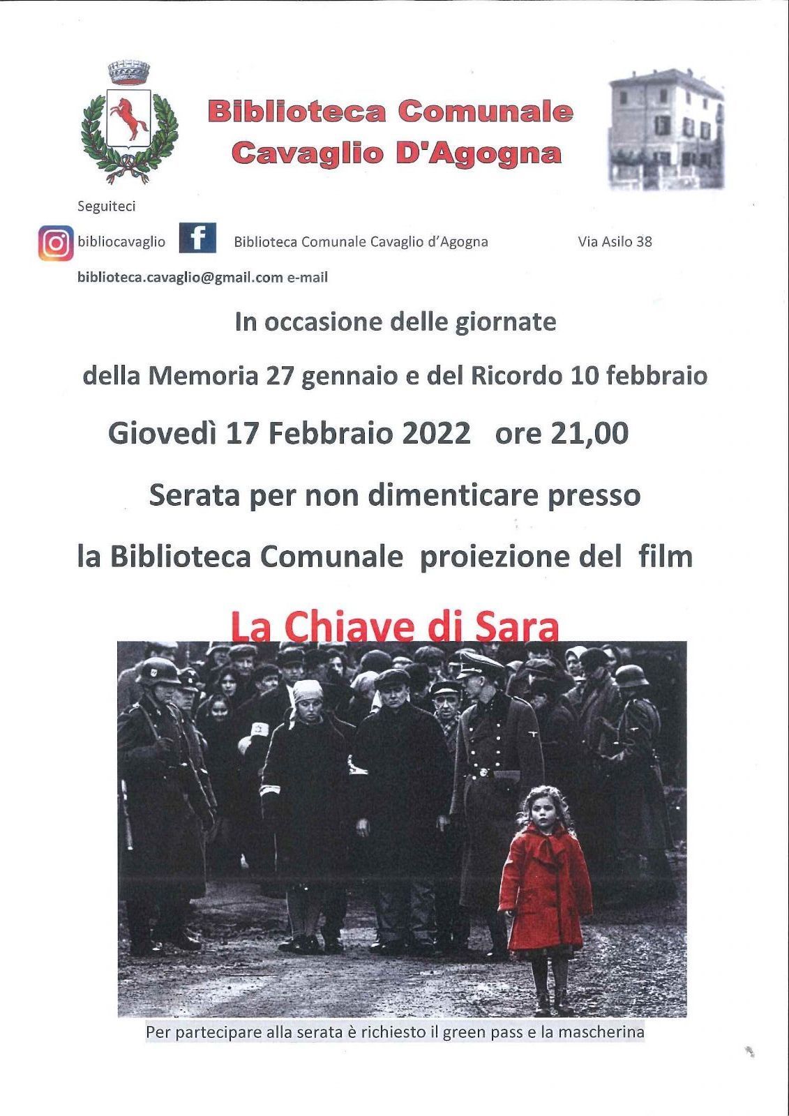 In occasione delle giornate della Memoria 27 gennaio e del Ricordo 10 febbraio si svolgerà una serata presso la sede della Biblioteca comunale, sita in Via Asilo n. 38, con la proiezione del film "La Chiave di Sara".