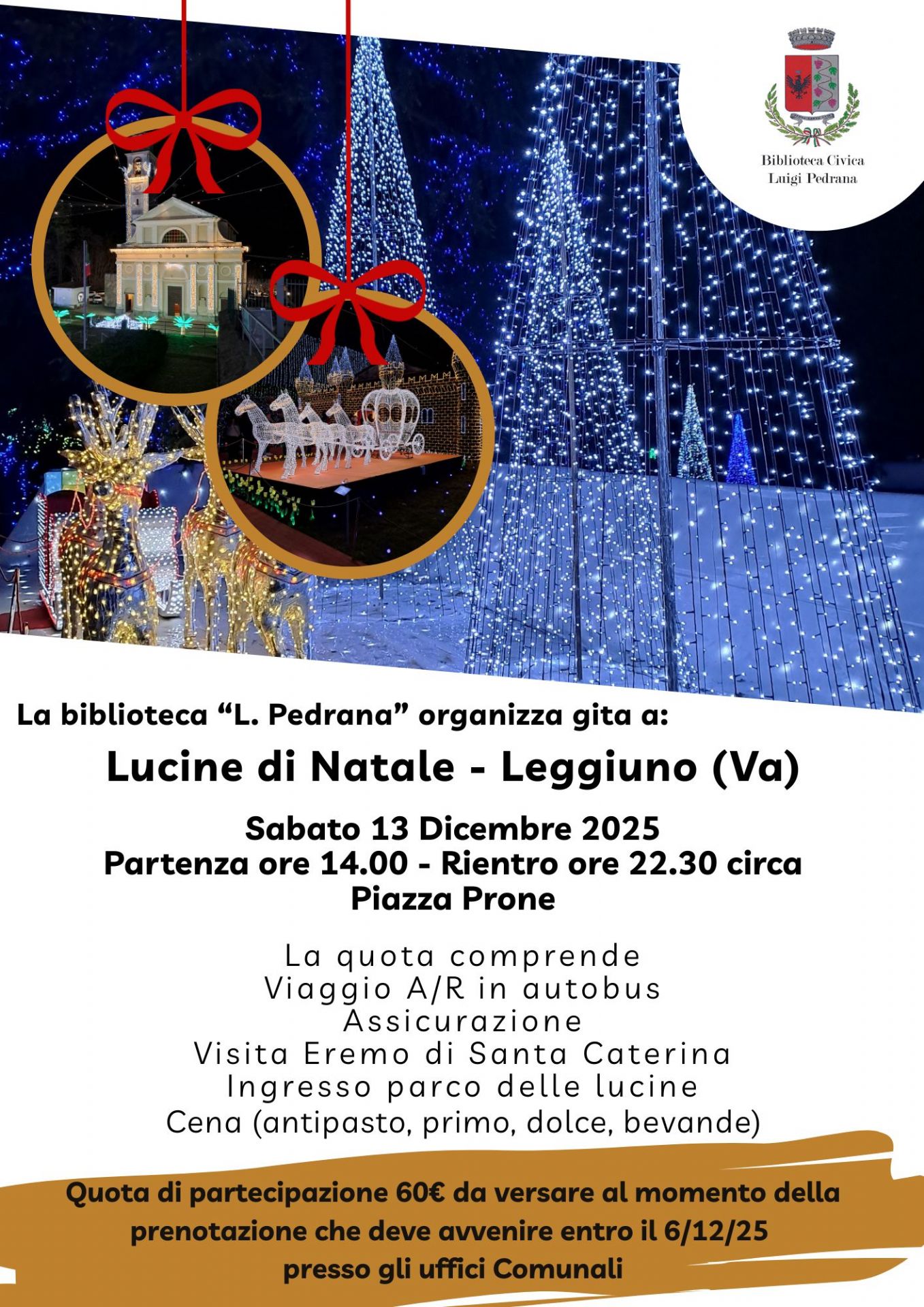 La biblioteca civica "L. Pedrana" organizza la consueta gita Natalizia, meta 2025 Leggiuno in Provincia di Varese con il suo suggestivo parco delle lucine.