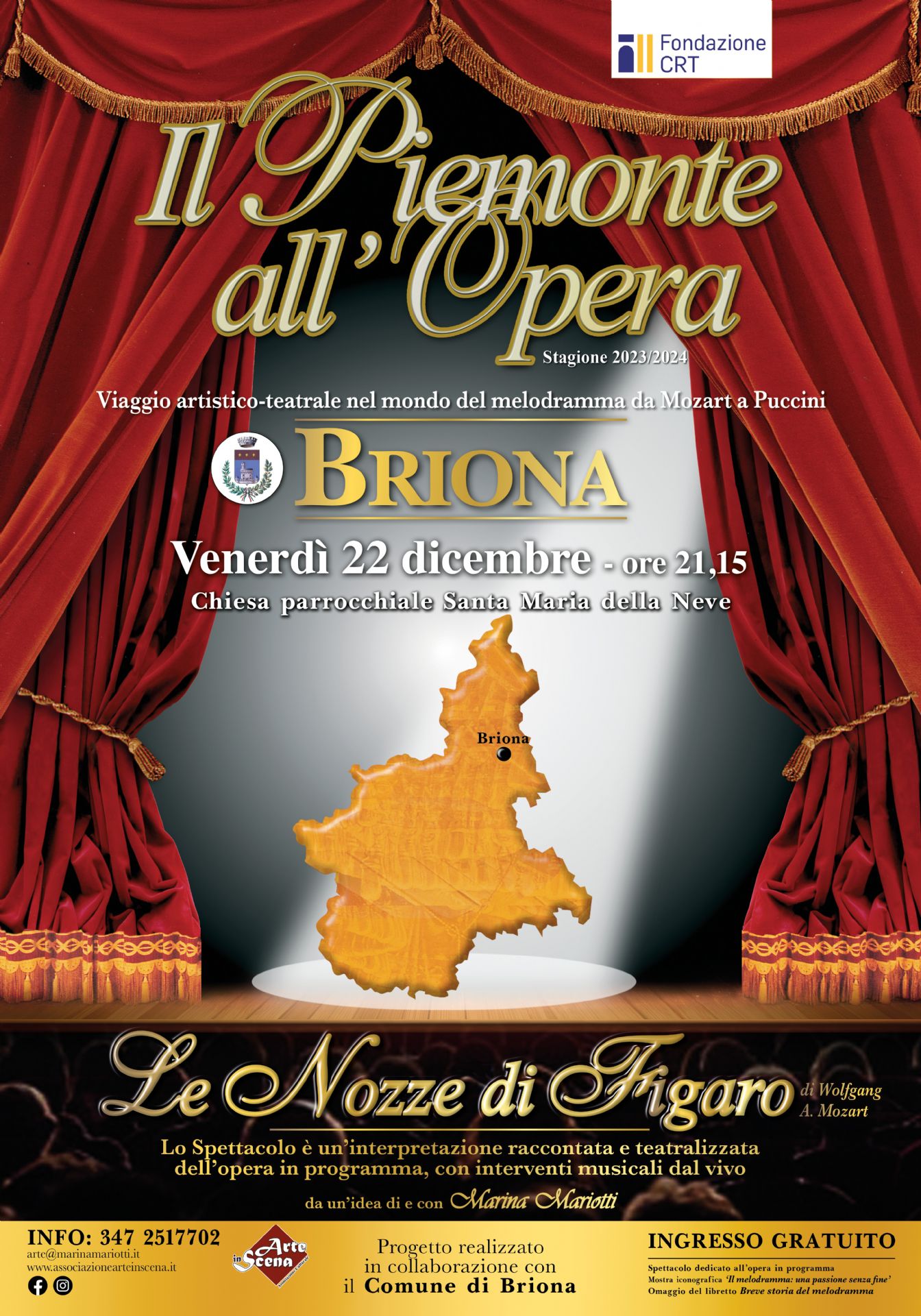 Da un'idea di e con Marina Mariotti, il Comune di Briona è lieto di invitarvi venerdì 22 dicembre, alle 21.15 presso la Chiesa Parrocchiale Santa Maria della Neve, allo spettacolo "Le Nozze di Figaro - Il Piemonte all'Opera".