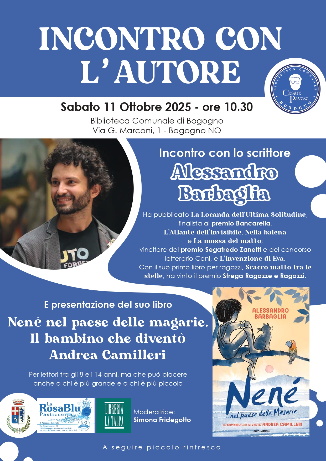 Moderatrice Simona Fridegotto. Evento in collaborazione con Pasticceria La rosa blu e Libreria La Talpa.