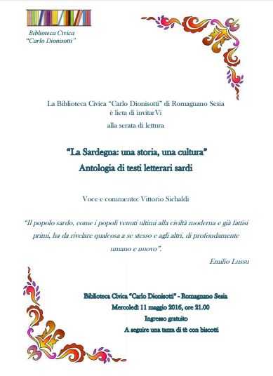 Mercoledì 11 maggio 2016 alle ore 21.00 la Biblioteca Civica “Carlo Dionisotti” di Romagnano Sesia ospiterà una serata dedicata alla letteratura sarda dal titolo “La Sardegna: una storia, un cultura”. L’evento prevede una lettura antologica degli autori contemporanei più rappresentativi, con la voce narrante e il commento di Vittorio Sicbaldi, docente di Lettere. “Si tratta di un’occasione per avvicinarsi a una produzione vitale e affascinante, che ha qualcosa di profondamente umano e nuovo da raccontare, come sostiene Emilio Lussu”, dichiara Martina Volpato, Presidente del Consiglio di Biblioteca.