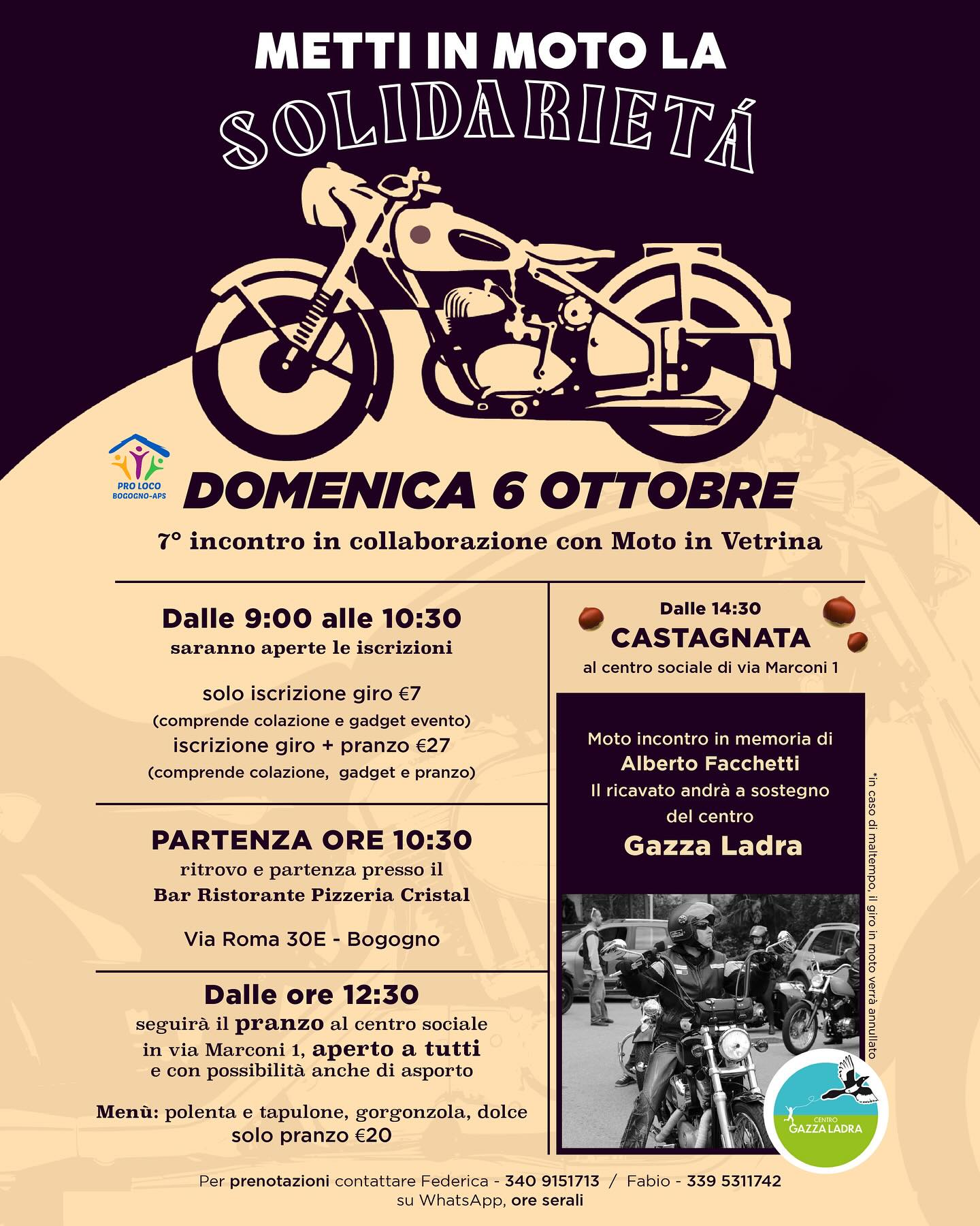 Domenica 6 Ottobre evento benefico organizzato dalla Pro Loco di Bogogno “Metti in moto la solidarietà” a sostegno del centro Gazza Ladra: moto incontro in memoria di Alberto Facchetti con ritrovo e partenza alle ore 10.30 dal Bar Ristorante Pizzeria Cristal, seguito dal pranzo sotto al tendone del centro sociale dalle ore 12.30, con possibilità anche di asporto.