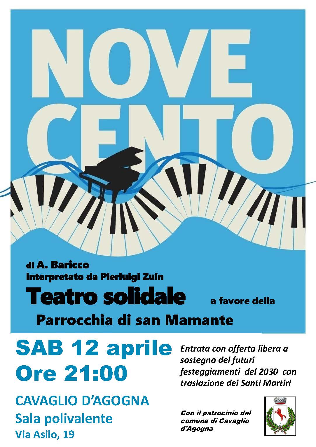 "Novecento" di A. Baricco interpretato da Pierluigi Zuin - Teatro solidale a favore della Parrocchia di San Mamante