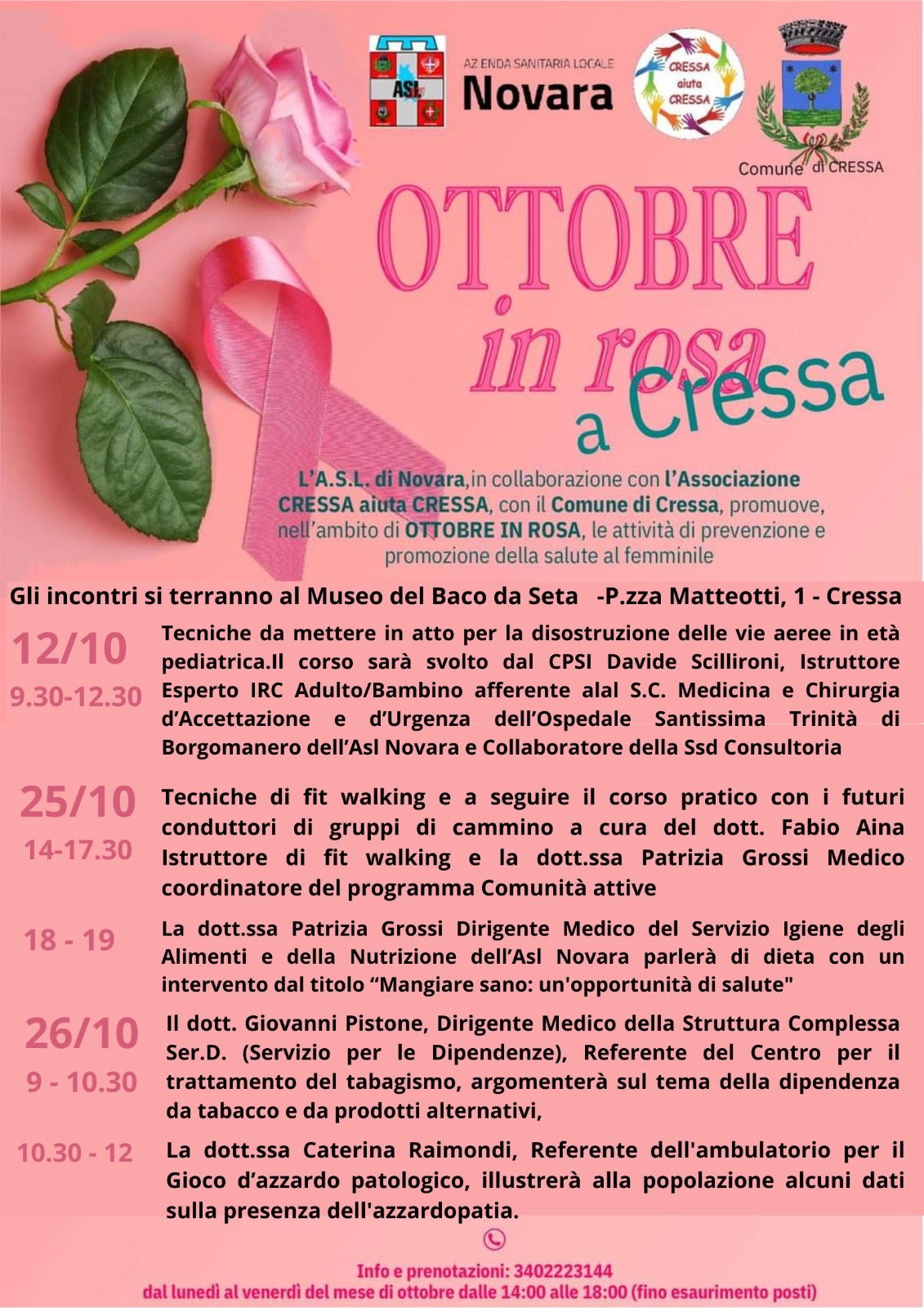 L'Associazione CRESSA aiuta CRESSA organizza, con la collaborazione dell'ASL NO di Novara, una serie di incontri nell'ambito di Ottobre in Rosa, per la promozione delle attività di prevenzione e tutela della salute al femminile.