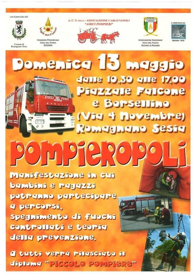 Domenica 13 Maggio dalle 10:30 alle 17:00 presso piazzale Falcone e Borsellino si terrà la manifestazione "Pompieropoli". Bambini, ragazzi potranno partecipare a percorsi, spegnimento di fuochi controllati e teoria della prevenzione. A tutti verrà rilasciato il diploma "Piccolo pompiere"