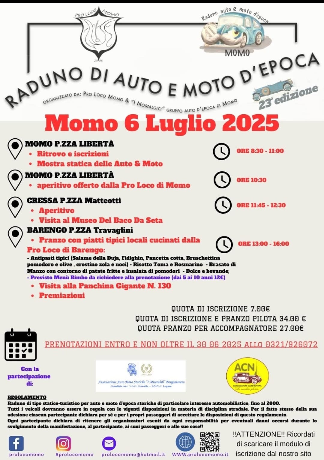 L'Associazione CRESSA aiuta CRESSA ospita l'evento organizzato dalla Pro-Loco di Momo in collaborazione con il Gruppo "I Nostalgici" Raduno di Auto e Moto d'epoca Domenica 6 Luglio 2025.