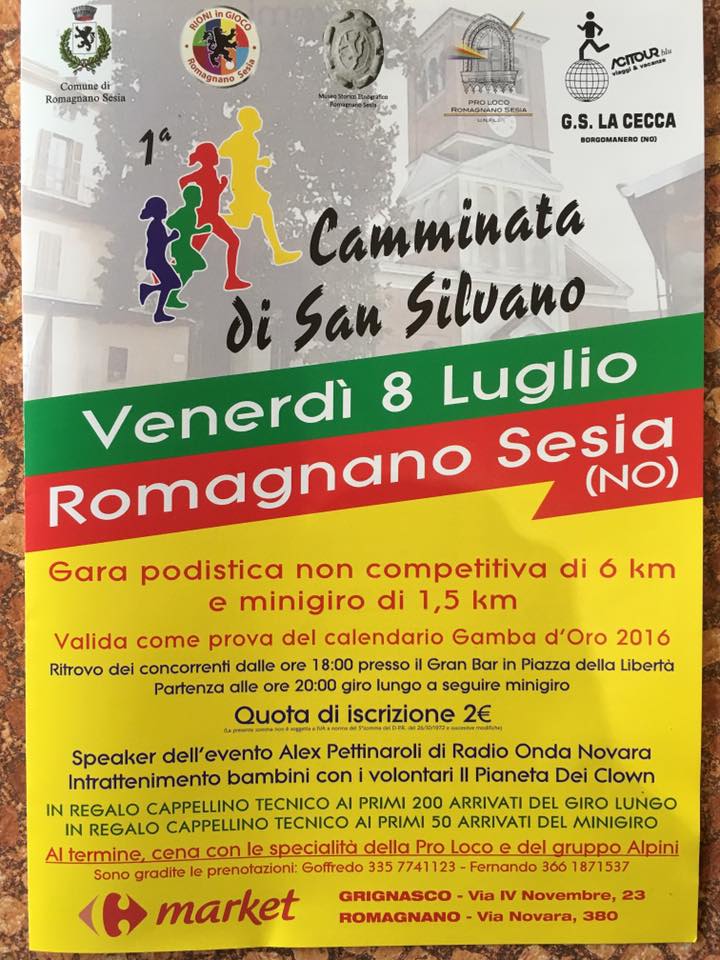Mancano ancora due mesi, ma Romagnano si sta già preparando per un altro grande evento: “1° Camminata di San Silvano”. La manifestazione, organizzata dalla G.S. LA CECCA di Borgomanero, con il contributo e il sostegno del Comune di Romagnano Sesia, Pro Loco e la collaborazione dei Rioni in Gioco, Museo Storico Etnografico, è in programma per venerdì 8 luglio in occasione delle festività patronali. La gara podistica, valida come prova del calendario della Gamba d’Oro 2016 prevede un circuito di 6 km per le vie del paese, un suggestivo percorso che toccherà le zone e le bellezze del paese novarese. Inoltre è previsto un minigiro di 1,5 km. Il ritrovo per i concorrenti è per le 18 in piazza Libertà presso il Gran Bar. La partenza del giro lungo verrà data alle 20 e a seguire si correrà il minigiro. Asd Cecca Borgomanero, Comune di Romagnano e Pro Loco da mesi stanno mettendo a punto la manifestazione per accogliere al meglio i partecipanti grazie alla collaborazione di numerosi volontari. "Siamo contenti di poter ospitare per la prima volta a Romagnano - commenta il consigliere delegato allo Sport Gian Mario Paracchini - la Gamba d'Oro. Come Amministrazione volevamo portare questa corsa nelle nostre vie per l'importanza agonista e non solo che riveste. Ci siamo riusciti grazie all'Asd Cecca di Borgomanero".