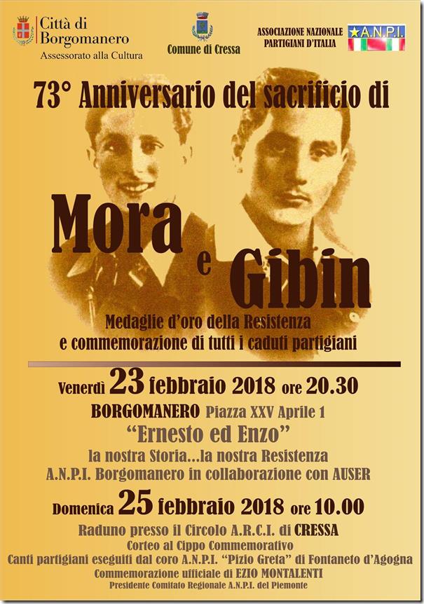 L'Amministrazione Comunale di Cressa, unendosi al Comune di Borgomanero, desidera RICORDARE nel suo 73^ Anniversario, il sacrificio dei Coraggiosi Giovani Partigiani Enzo Gibin ed Ernesto Mora, Medaglie d'Oro della Resistenza.