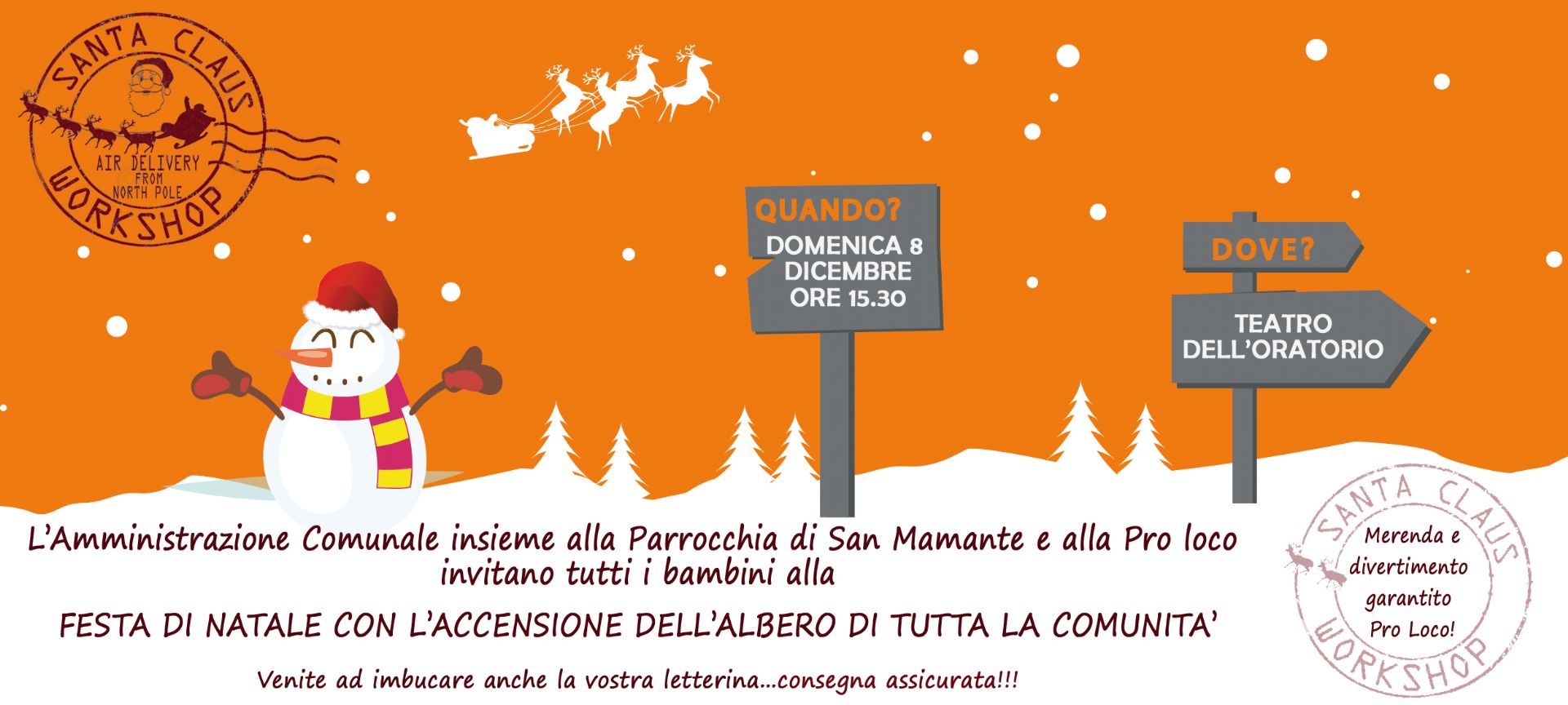 L'Amministrazione Comunale insieme alla Parrocchia di san Mamante e alla Pro Loco invitano tutti i bambini alla Festa di Natale con accensione dell'albero di tutta la comunità.