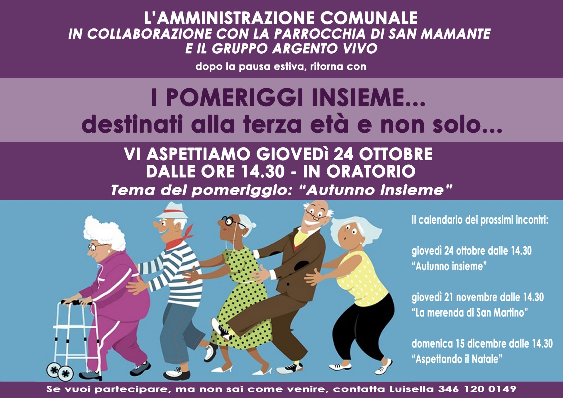 L'Amministrazione Comunale in collaborazione con la Parrocchia di San Mamante e il Gruppo Argento Vivo dopo la pausa estiva, ritorna con "I pomeriggi insieme... destinati alla terza età e non solo..."