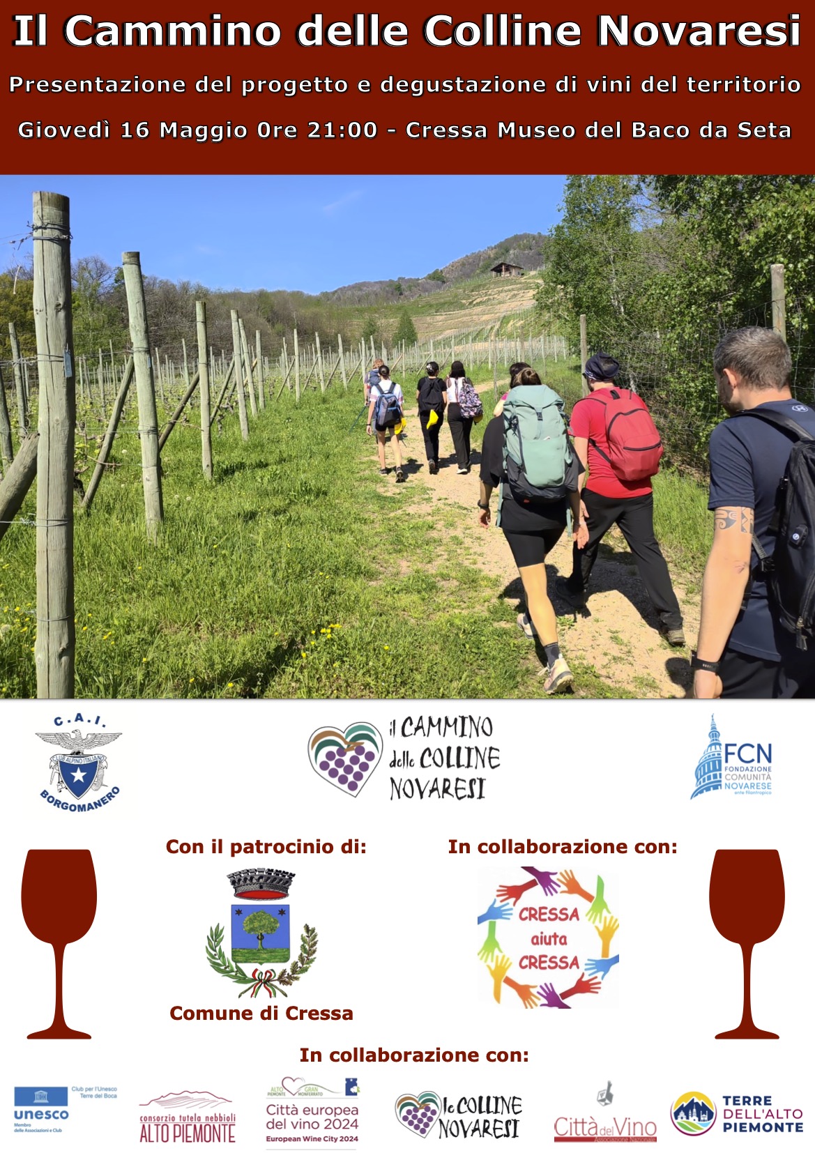 Giovedì 16 Maggio 2024 alle ore 21.00 Serata di presentazione, a cura del CAI di Borgomanero, del Progetto "Il Cammino delle Colline Novaresi" presso il Museo del Baco da Seta, a cui seguirà una degustazione dei vini del territorio.