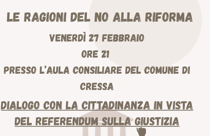 Si informa la Cittadinanza che Venerdì 27 Febbraio 2026 alle ore 21.00 presso l'Aula Consiliare del Comune di Cressa si terrà un incontro pubblico dal titolo "Le Ragioni del NO alla Riforma".