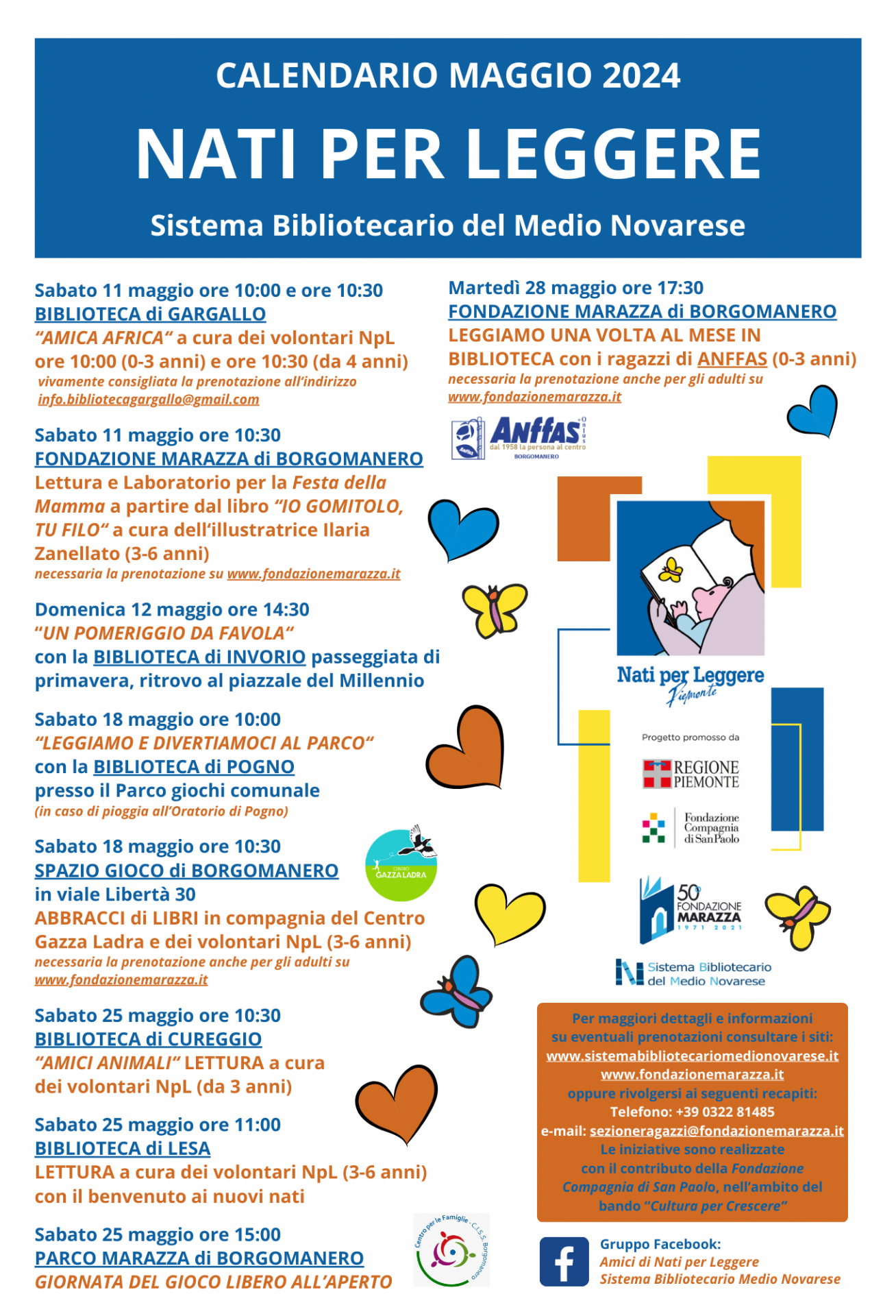 Con la presente si segnalano i diversi appuntamenti legati a Nati per Leggere e dedicati alle famiglie con bambini nella fascia 0-6 anni che si svolgeranno durante il mese di maggio nel Sistema Bibliotecario del Medio Novarese, come riportato nel calendario allegato