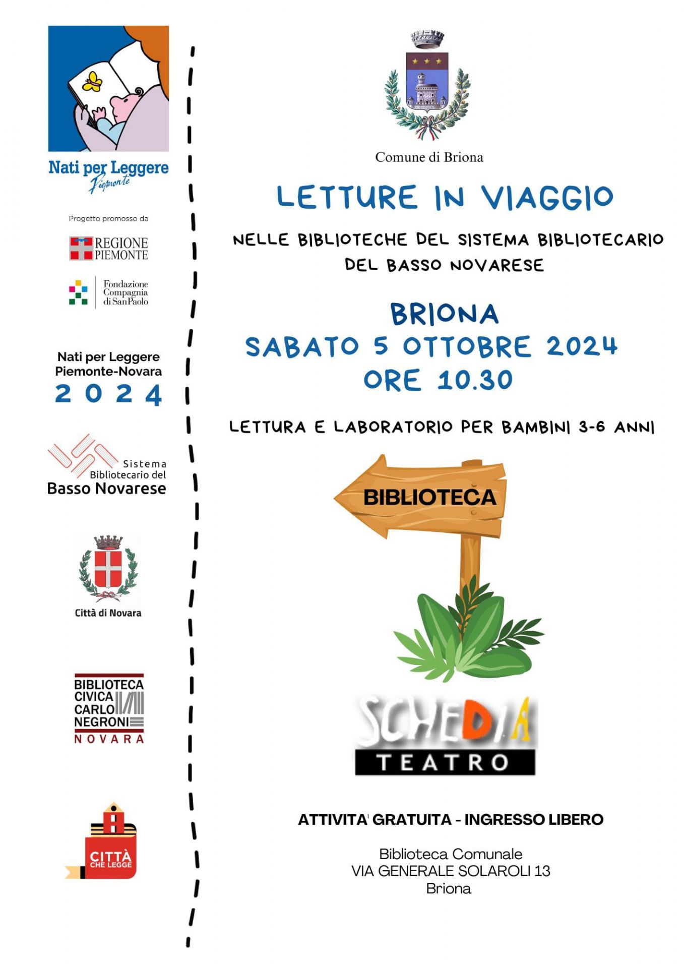 Sabato 5 ottobre alle 10.30 alla Biblioteca di Briona “Giancarlo Tornaco” si terrà un incontro di lettura e laboratorio per bambini dai 3 ai 6 anni, organizzato nell'ambito del programma "Nati per Leggere".