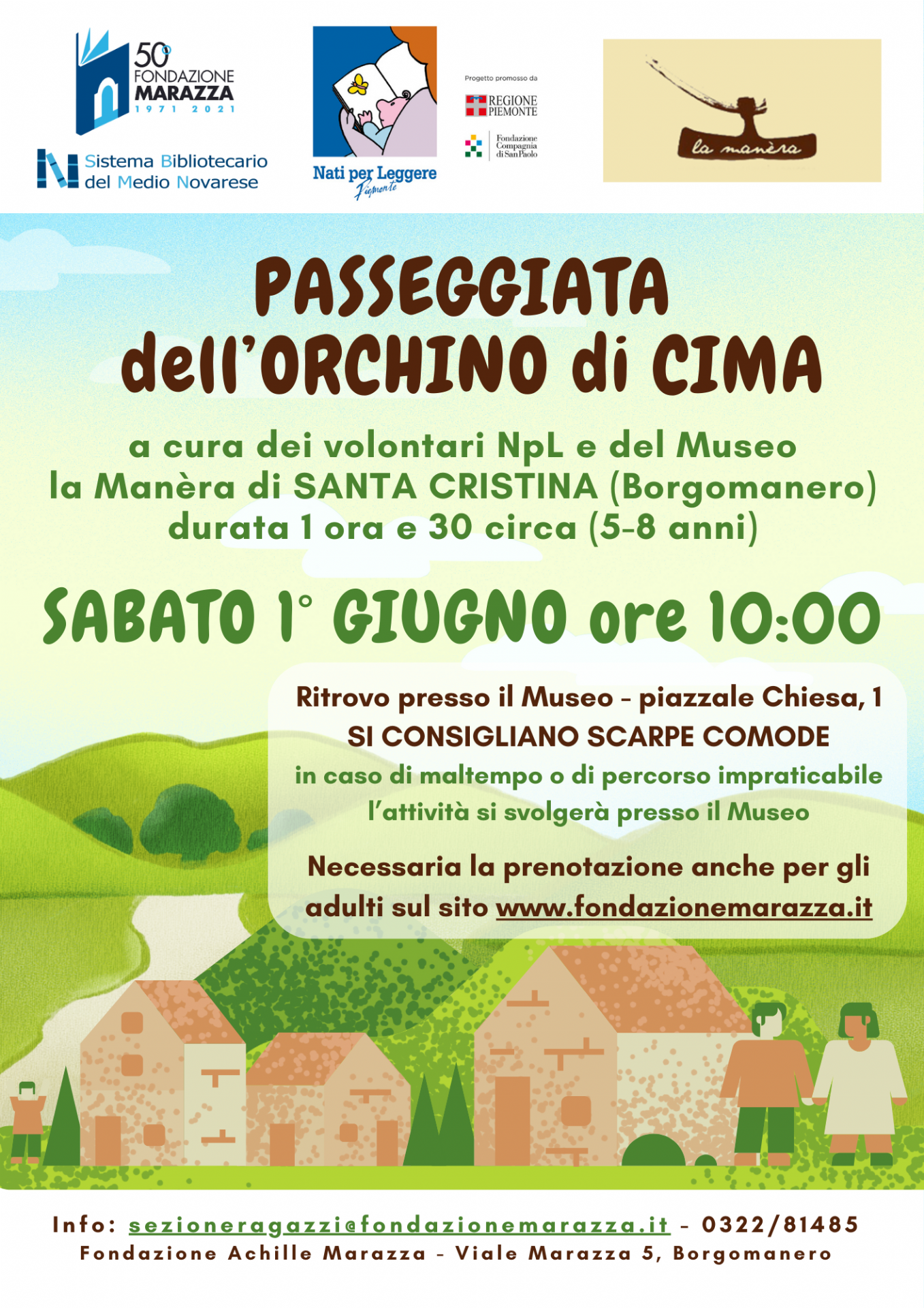La presente per segnalarvi che sabato 1 giugno si svolgerà la Passeggiata dell'Orchino di Cima a cura dei volontari Nati per Leggere e del Museo la Manèra di Santa Cristina a Borgomanero, un percorso nella natura arricchito da letture ad alta voce e da tante sorprese. Il ritrovo sarà alle ore 10:00 presso il museo in piazzale Chiesa 1, si consigliano scarpe comode e adatte anche allo sterrato. In caso di maltempo o di percorso impraticabile per lo stesso l’attività si svolgerà all'interno degli spazi del museo.