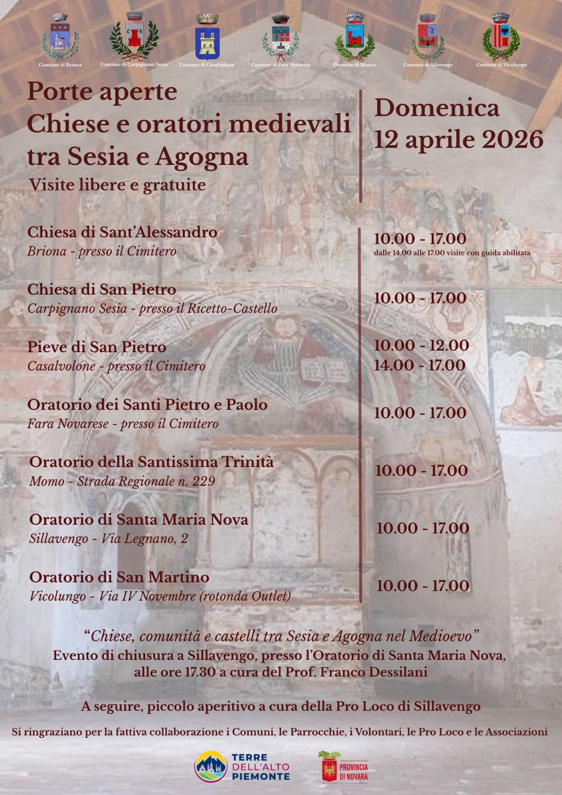 Domenica 12 aprile si terrà l’evento “Porte aperte. Chiese e oratori medievali tra Sesia e Agogna” in collaborazione con altri sei comuni e il supporto dell’Agenzia Turistica Locale di Novara. In questa occasione si potrà, gratuitamente e a orario continuato 10-17, visitare 7 meravigliose chiese dei dintorni solitamente chiuse al pubblico.