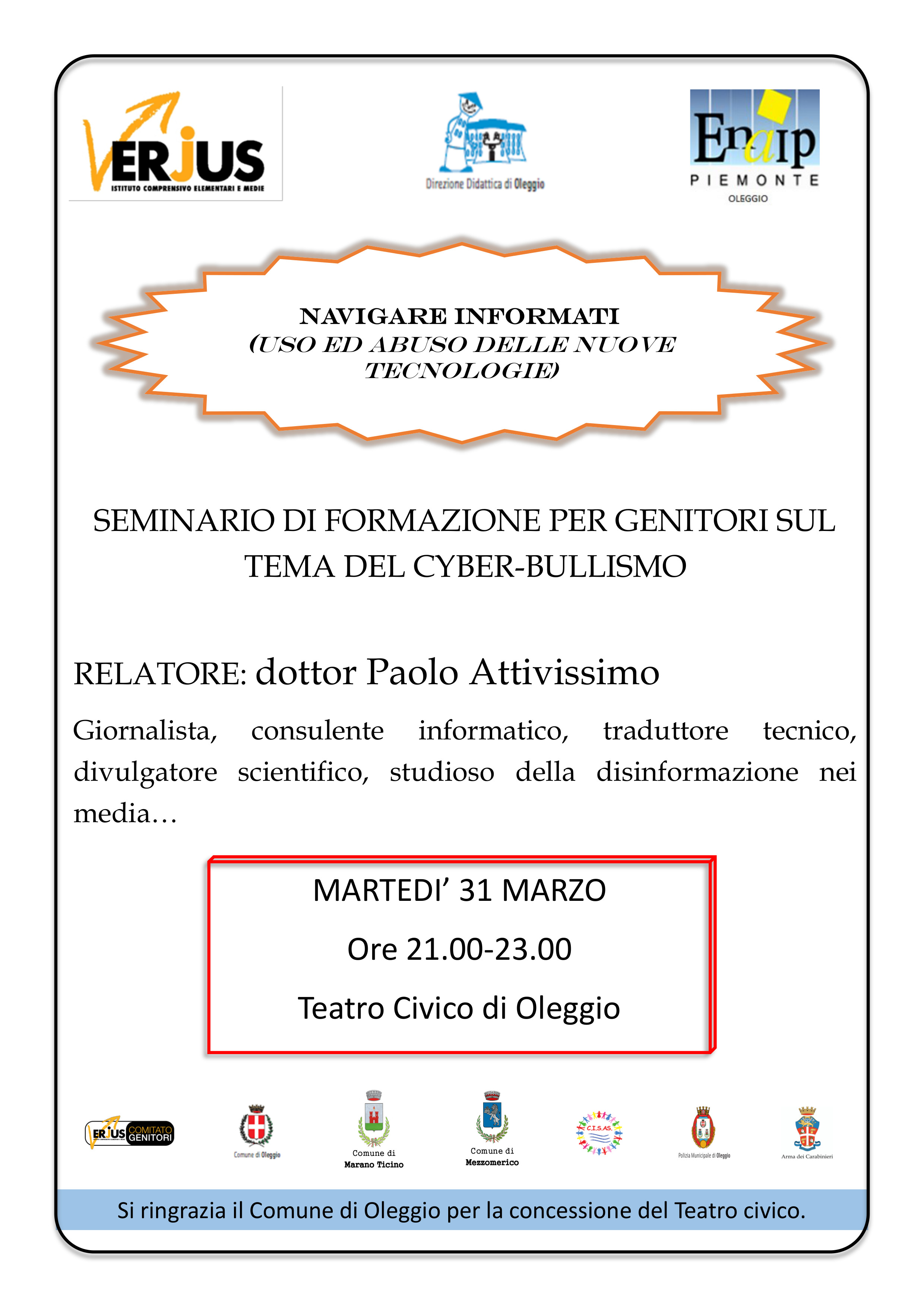 Organizzata dall'Istituito Comprensivo Elementari e Medie di Oleggio, la Direzione Didattica di Oleggio e l'ENAIP di Oleggio si terrà, Martedì 31 Marzo 2015 dalle ore 21.00 alle ore 23.00 presso il Teatro Civico di Oleggio, un seminario di formazione per i genitori sul tema del cyber-bullismo.