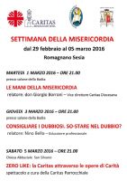 Una settimana di appuntamenti in occasione della “Settimana della misericordia” organizzata dalla Caritas di Romagnano Sesia. Martedì 1 marzo alle ore 21 presso il salone della badia “Le mani della misericordia” con don Giorgio Borroni – vice direttore della caritas diocesana. Giovedì 3 marzo alle 21 “Consigliare i dubbiosi. So-stare nel dubbio?” relatore Nino Bello educatore professionale. Infine sabato 5 marzo alle 21 in chiesa abbaziale S. Silvano “Zero Like: la Caritas attraverso le opere di Carità”, spettacolo a cura della caritas parrocchiale.