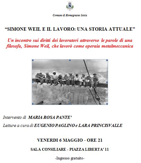 “Simone Weil e il lavoro: una storia attuale” è il titolo di una serata dedicata al mondo del lavoro e ai diritti spesso negati. L’incontro, organizzato dall’Assessorato alla Cultura, è un viaggio attraverso le parole di una filosofa, Simone Weil, che lavorò come operaia metalmeccanica. L’appuntamento è per venerdì 6 maggio alle ore 21 in sala consiliare del Comune di Romagnano Sesia. Interverrà Maria Rosa Pantè, letture a cura di Eugenio Paglino e Lara Princisvalle. Ingresso libero e gratuito