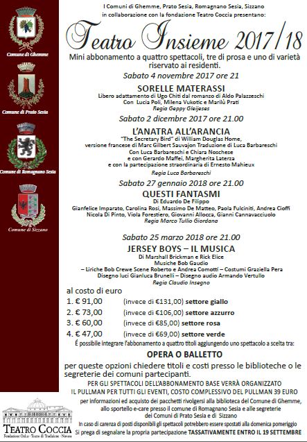 Il mini abbonamento a quattro spettacoli, due di prosa e due di varietà, è riservato ai residenti di Romagnano, Prato, Ghemme e Sizzano. L’abbonamento prevede i seguenti spettacoli:
