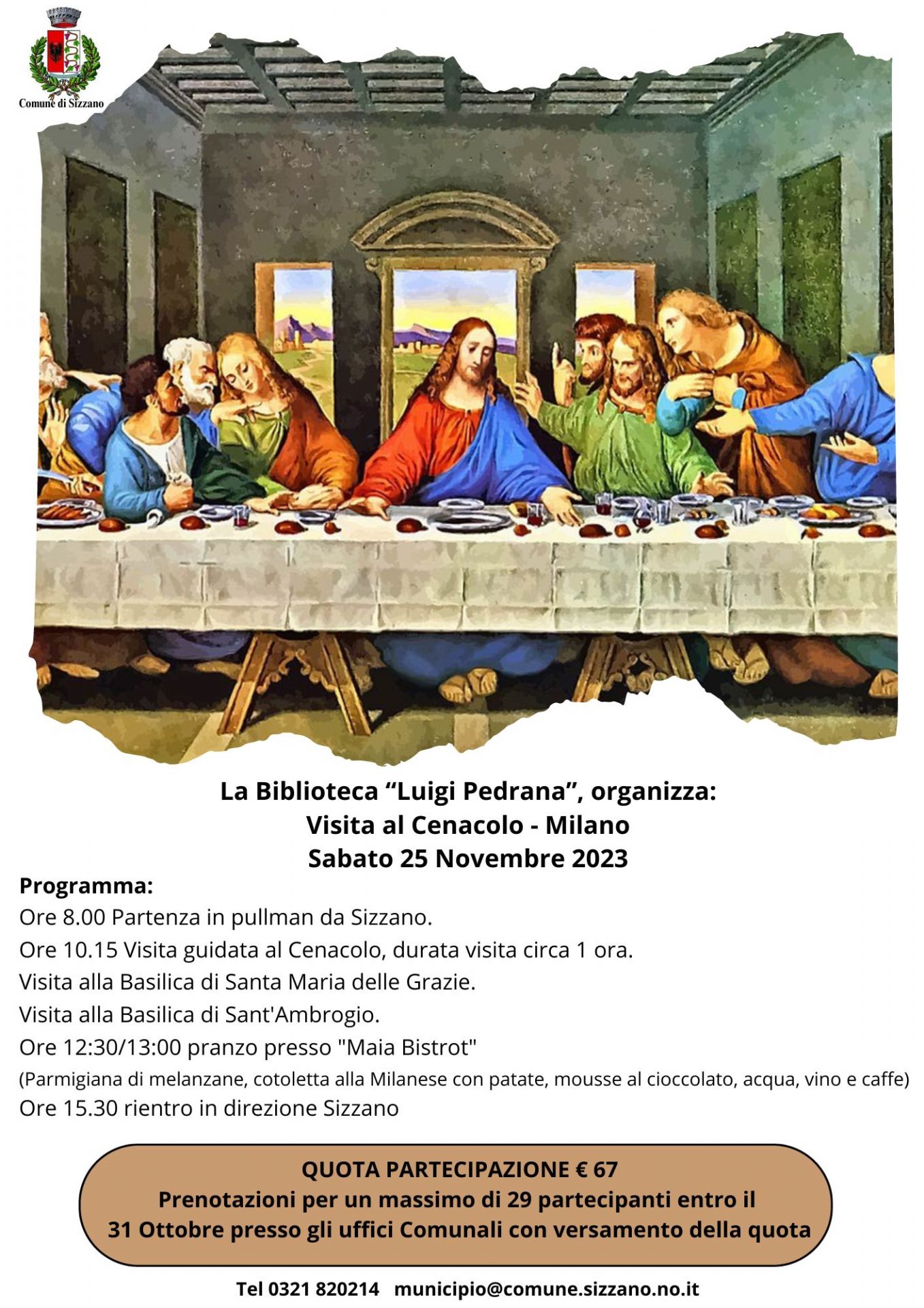 La biblioteca "Luigi Pedrana" organizza per sabato 25 Novembre una visita guidata al Cenacolo Vinciano.