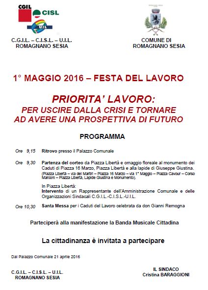 1° MAGGIO 2016 – FESTA DEL LAVORO