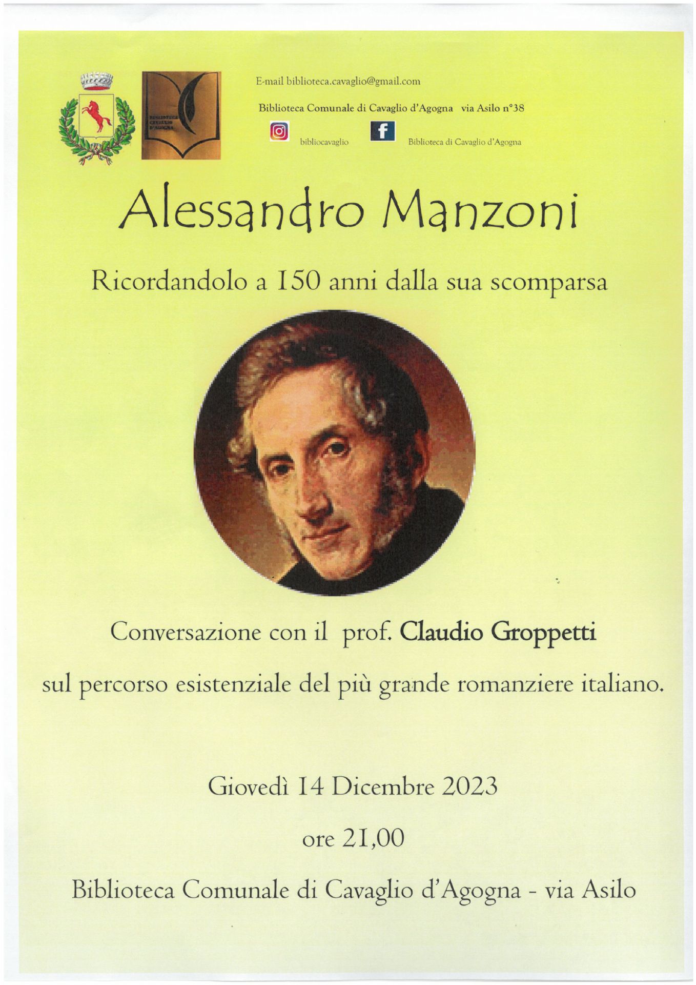 Giovedì 14 dicembre 2023 alle ore 21.00 presso la sede della Biblioteca Comunale sita in Via Asilo n. 38 si terrà l'incontro col prof. Claudio Groppetti per illustrare il percorso esistenziale del più grande romanziere italiano, Alessandro Manzoni, ricordandolo a 150 anni dalla sua scomparsa.