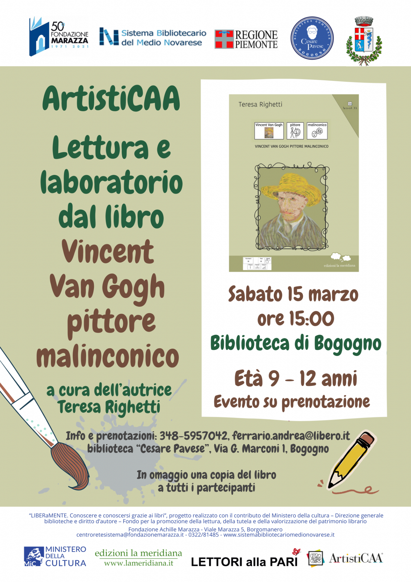Sabato 15 marzo alle ore 15.00, lettura e laboratorio dal libro "Vincent Van Gigh pittore malinconico" a cura dell'autrice Teresa Righetti presso la Biblioteca comunale, rivolto a bambini tra 9 e 12 anni.