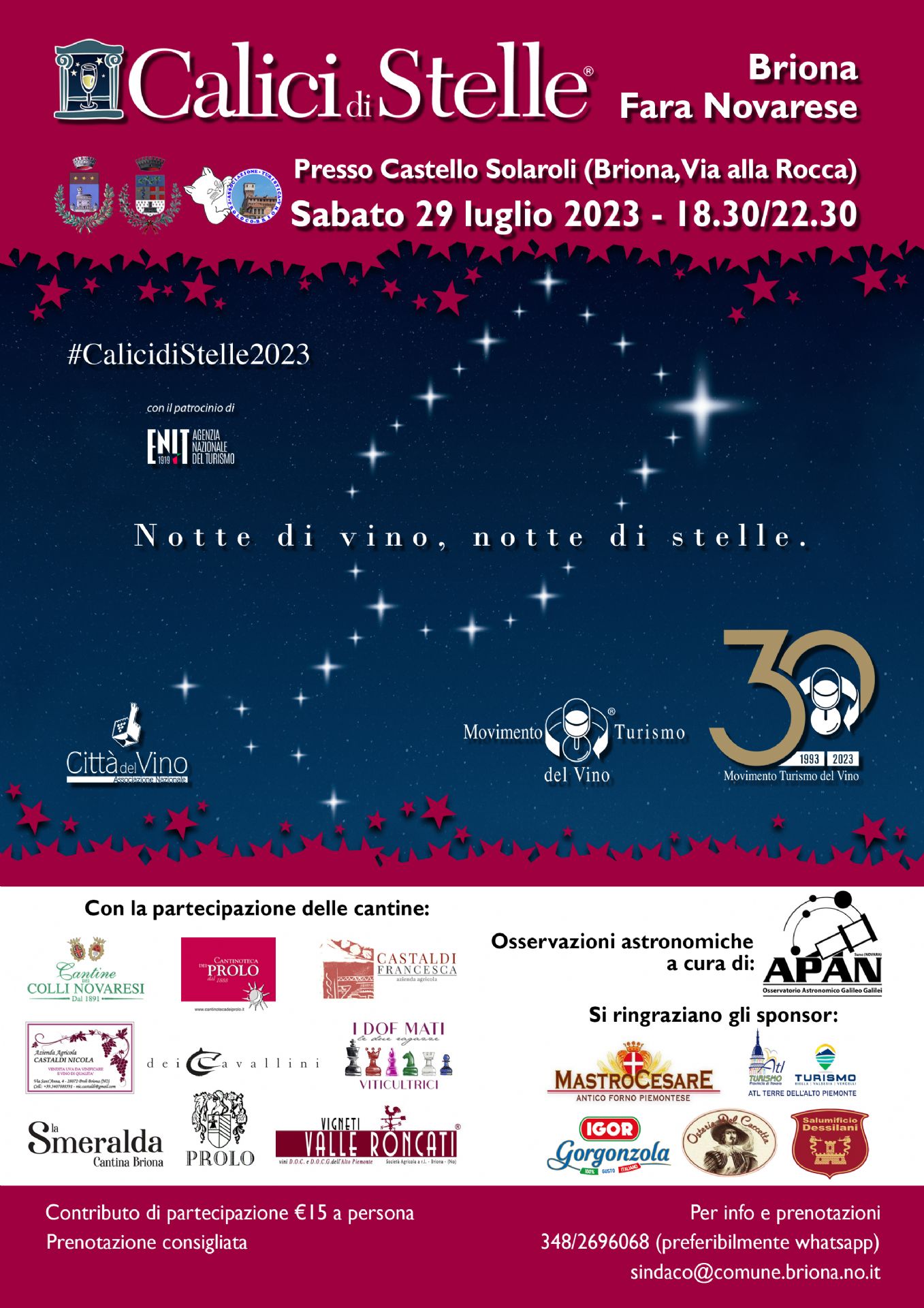 Una notte di vino e di stelle: dopo la “prima” del 2022, che ha visto coinvolto il territorio di Briona, nel 2023 “Calici di Stelle” torna sul territorio unendo le cantine di Briona e Fara Novarese, assieme ad altri produttori gastronomici del territorio. La manifestazione si terrà sabato 29 luglio dalle 18.30, per proseguire fino a tarda serata. “Apriremo le danze per gli eventi “Calici di Stelle” sul territorio dell’Alto Piemonte” dichiarano i sindaci di Briona e Fara Novarese, Davide Giordano e Aldo Giordano, “Si tratta di un evento molto importante per i due comuni e per i nostri produttori, anche alla luce della recente nomina dell’Alto Piemonte, assieme al Gran Monferrato, a Città Europea del Vino per il 2024”.