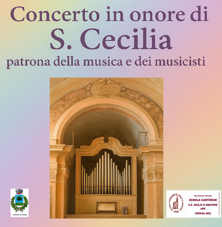 L'Associazione Culturale Schola Cantorum S.S. Giulio e Amatore propone un Concerto in suo onore, presso la Chiesa Parrocchiale S.S. Giulio e Amatore di Cressa, Sabato 29 Novembre p.v. alle ore 21.00, con i Musicisti Alessandro Tonietti all'Organo e la tromba di Giulio Lovati.