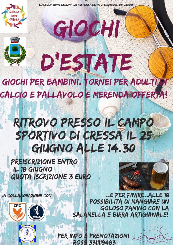 L'Associazione Cressa aiuta Cressa organizza per Domenica 25 Giugno 2023 presso il Campo Sportivo Comunale "Giochi d'Estate" - Giochi per Bambini - Tornei per Adulti
